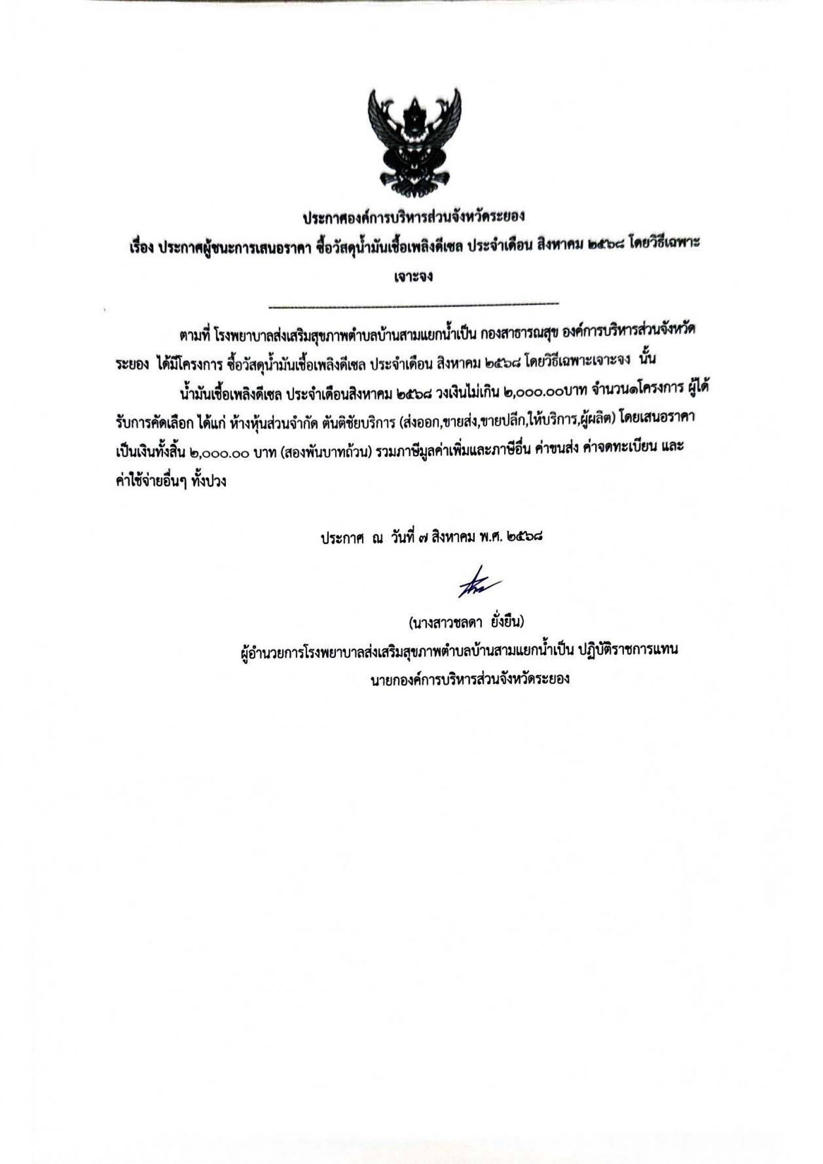 ประกาศผู้ชนะการเสนอราคา ซื้อวัสดุน้ำมันเชื้อเพลิงดีเซล ประจำเดือน สิงหาคม 2568 โดยวิธีเฉพาะเจาะจง