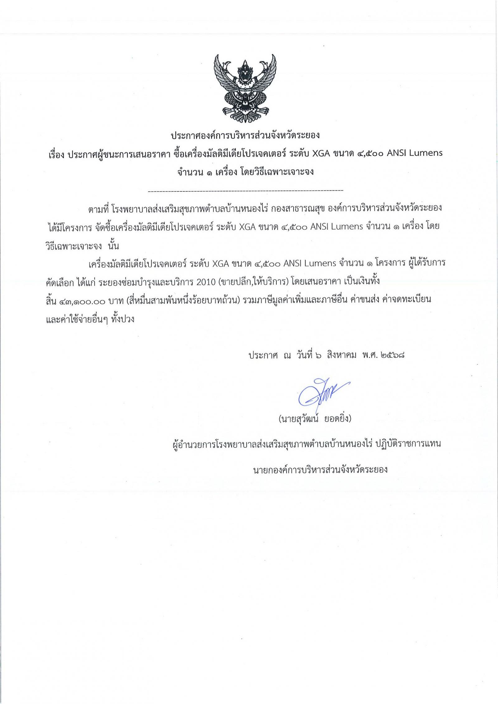 ประกาศผู้ชนะการเสนอราคา ซื้อเครื่องมัลติมีเดียโปรเจคเตอร์ ระดับ XGA ขนาด 4,500 ANSI Lumens จำนวน 1 เครื่อง