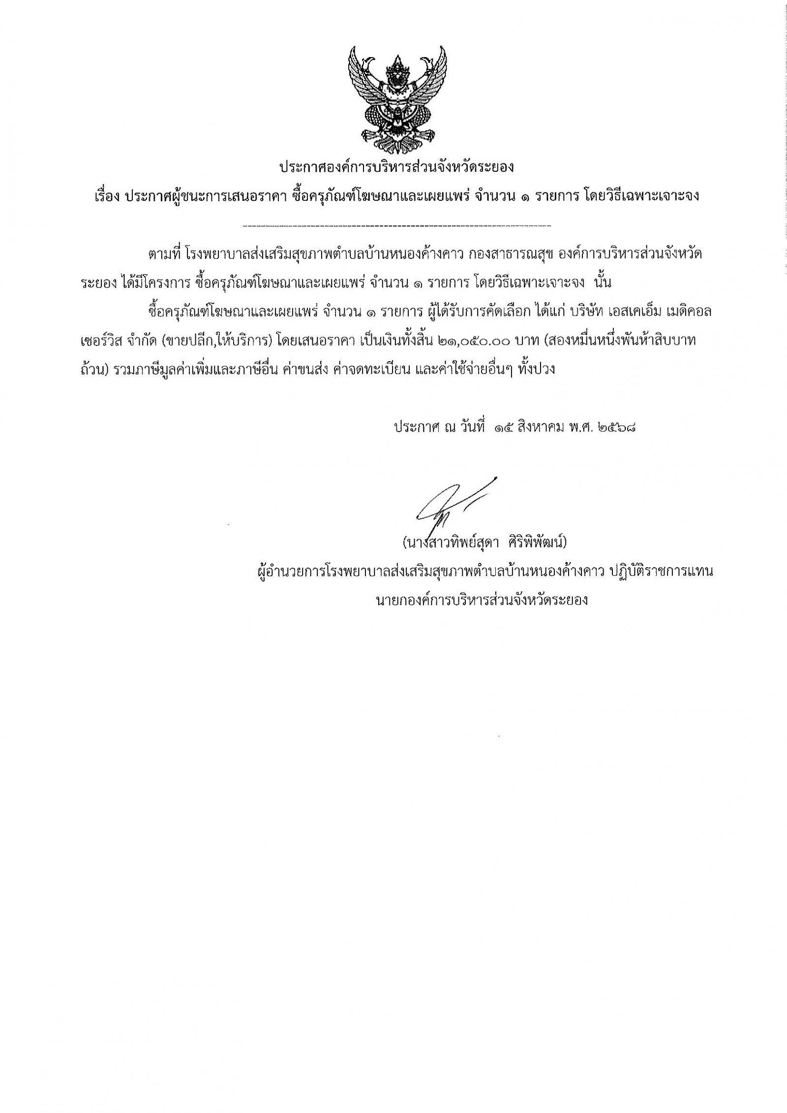ประกาศผู้ชนะการเสนอราคา ซื้อครุภัณฑ์โฆษณาและเผยแพร่ จำนวน 1 รายการ โดยวิธีเฉพาะเจาะจง