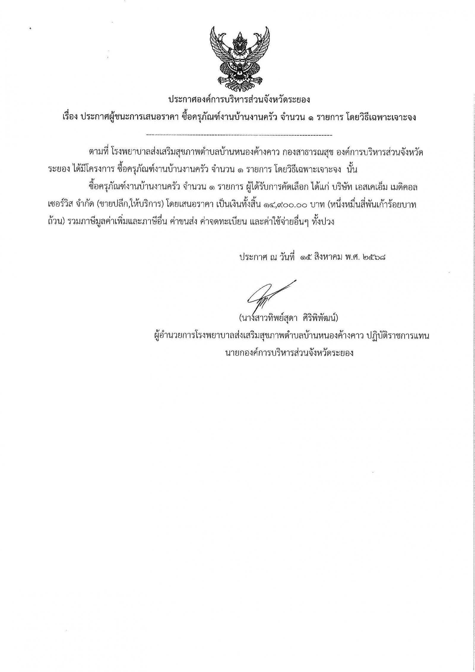 ประกาศผู้ชนะการเสนอราคา ซื้อครุภัณฑ์งานบ้านงานครัว จำนวน 1 รายการ โดยวิธีเฉพาะเจาะจง