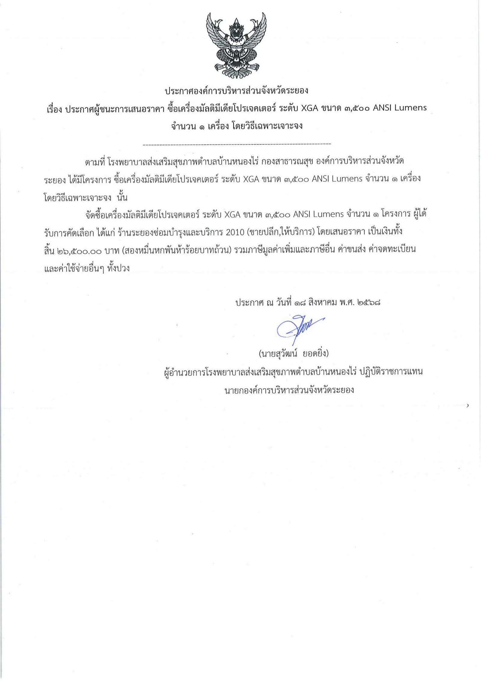 ประกาศผู้ชนะการเสนอราคา ซื้อเครื่องมัลติมีเดียโปรเจคเตอร์ ระดับ XGA ขนาด ๓,๕๐๐ ANSI Lumens จำนวน ๑ เครื่อง โดยวิธีเฉพาะเจาะจง