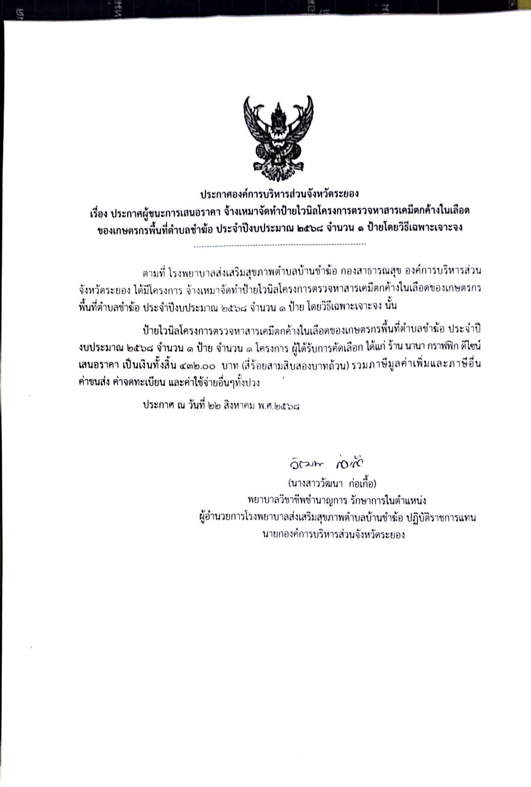 ประกาศผู้ชนะการเสนอราคา จ้างเหมาจัดทำป้ายไวนิลโครงการตรวจหาสารเคมีตกค้างในเลือดของเกษตรกรพื้นที่ตำบลชำฆ้อ ประจำปีงบประมาณ 2568 จำนวน 1 ป้าย โดยวิธีเฉพาะเจาะจง