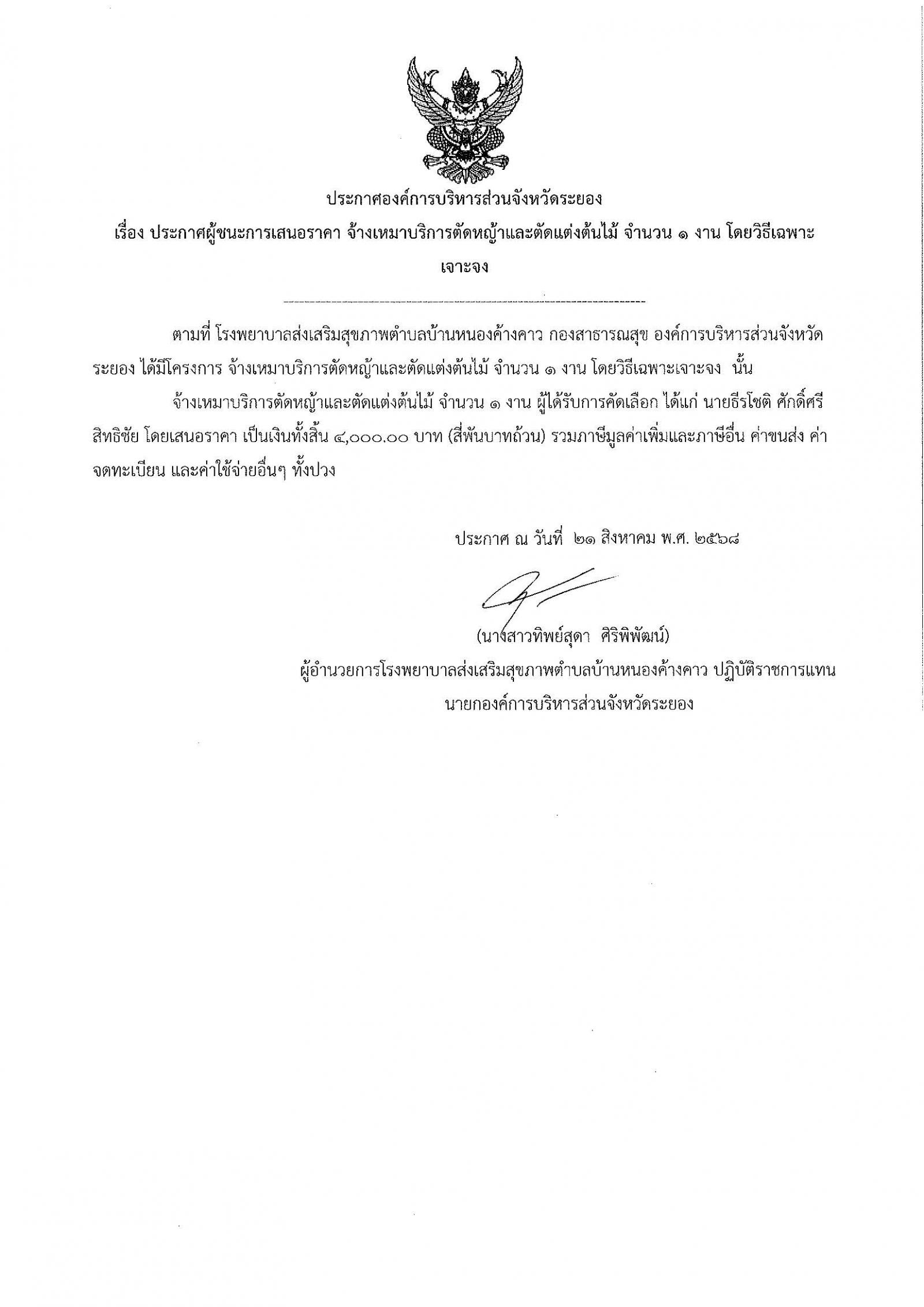 ประกาศผู้ชนะการเสนอราคา จ้างเหมาบริการตัดหญ้าและตัดแต่งต้นไม้ จำนวน 1 งาน โดยวิธีเฉพาะเจาะจง