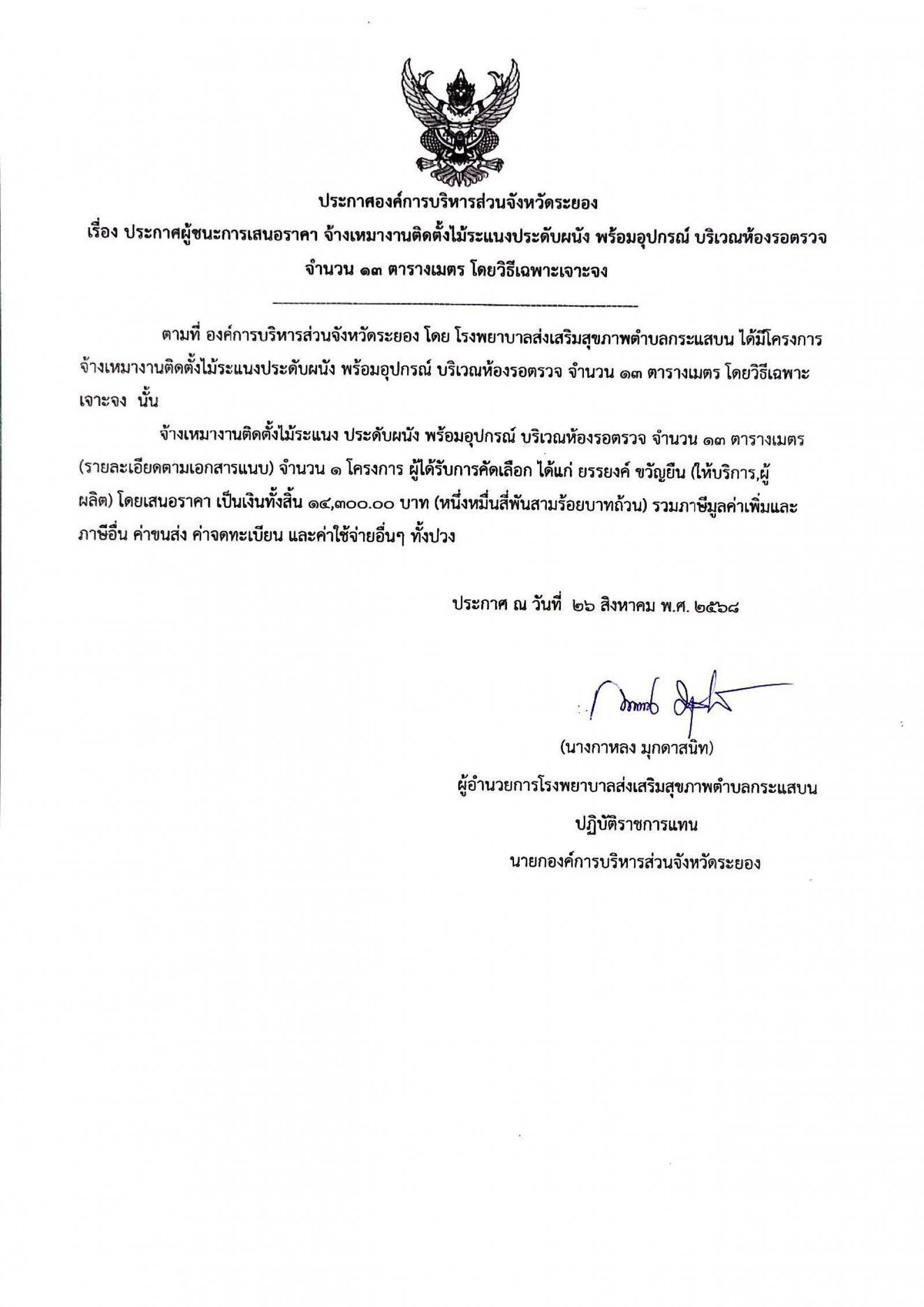 ประกาศผู้ชนะการเสนอราคา จ้างเหมางานติดตั้งไม้ระแนงประดับผนัง พร้อมอุปกรณ์ บริเวณห้องรอตรวจ จำนวน 13 ตารางเมตร โดยวิธีเฉพาะเจาะจง