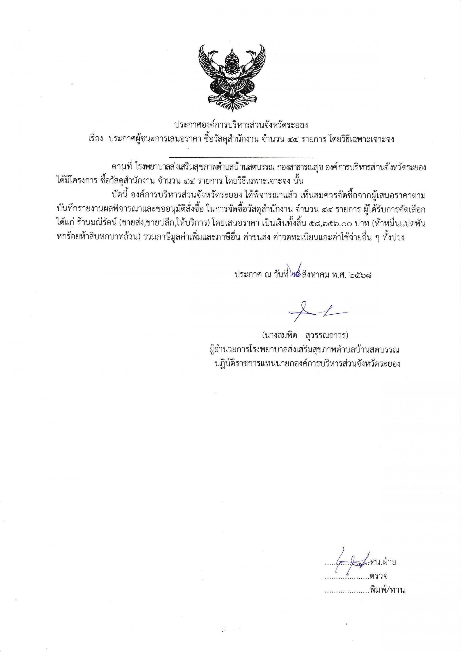 ประกาศผู้ชนะการเสนอราคา ซื้อวัสดุสำนักงาน จำนวน 44 รายการ โดยวิธีเฉพาะเจาะจง