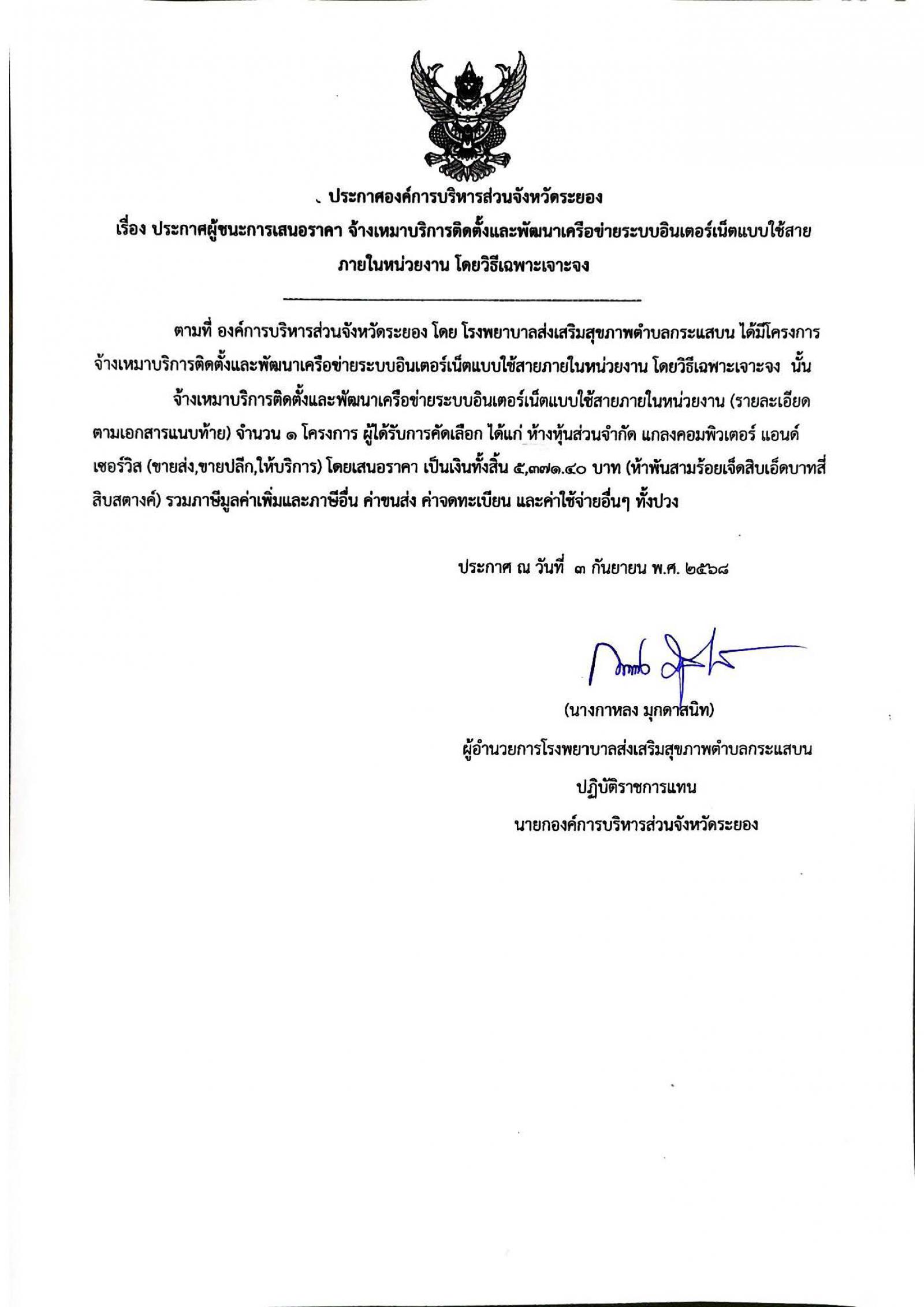 ประกาศผู้ชนะการเสนอราคา จ้างเหมาบริการติดตั้งและพัฒนาเครือข่ายระบบอินเตอร์เน็ตแบบใช้สายภายในหน่วยงาน โดยวิธีเฉพาะเจาะจง