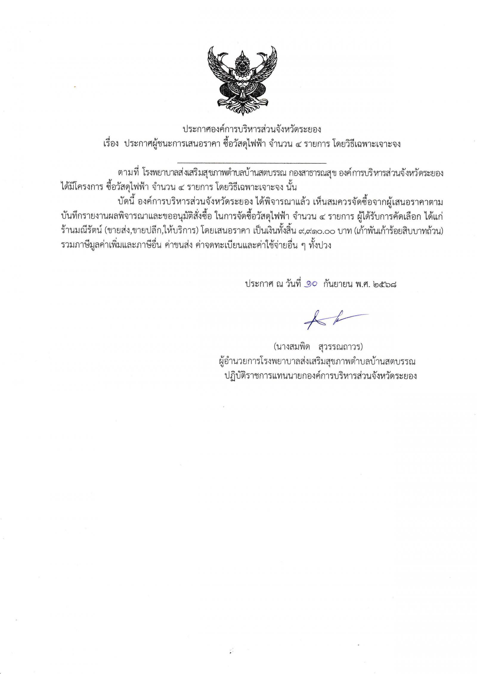 ประกาศผู้ชนะการเสนอราคา ซื้อวัสดุไฟฟ้า จำนวน 4 รายการ โดยวิธีเฉพาะเจาะจง