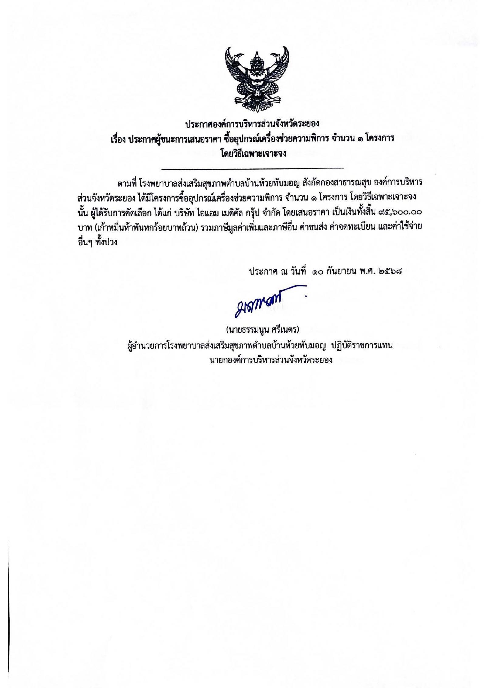 ประกาศผู้ชนะการเสนอราคา ซื้ออุปกรณ์เครื่องช่วยความพิการ จำนวน 1 โครงการ โดยวิธีเฉพาะเจาะจง