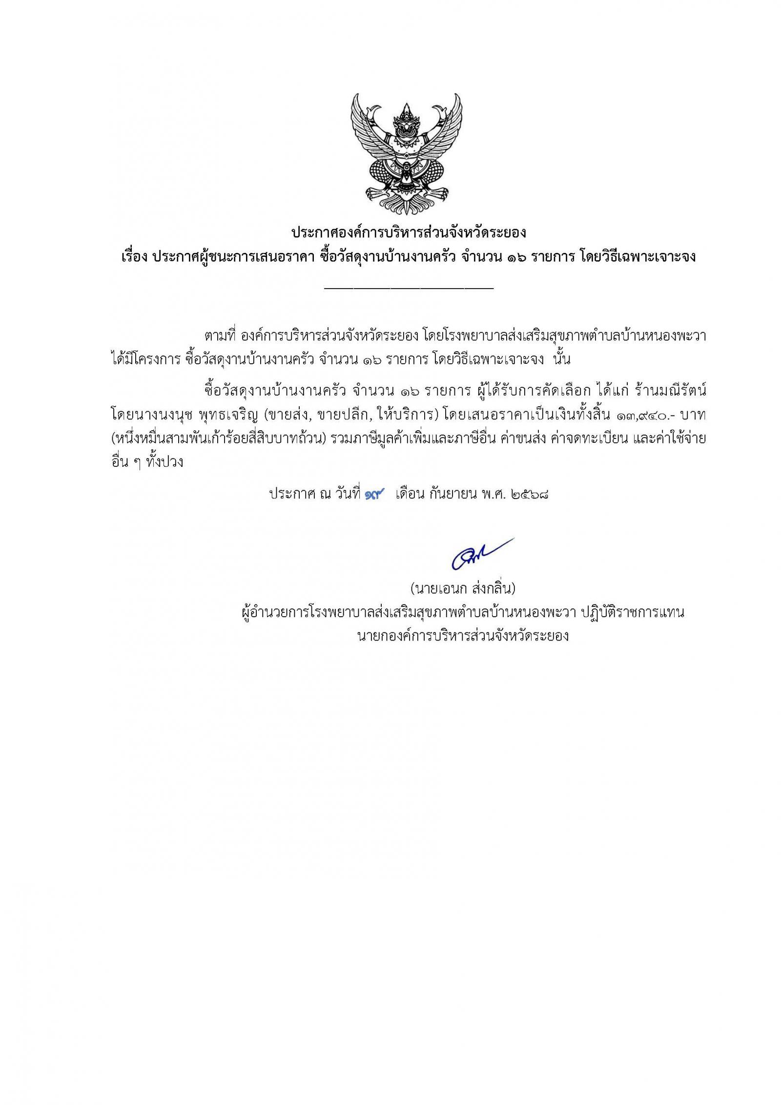 ประกาศผู้ชนะการเสนอราคา ซื้อวัสดุงานบ้านงานครัว จำนวน 16 รายการ โดยวิธีเฉพาะเจาะจง