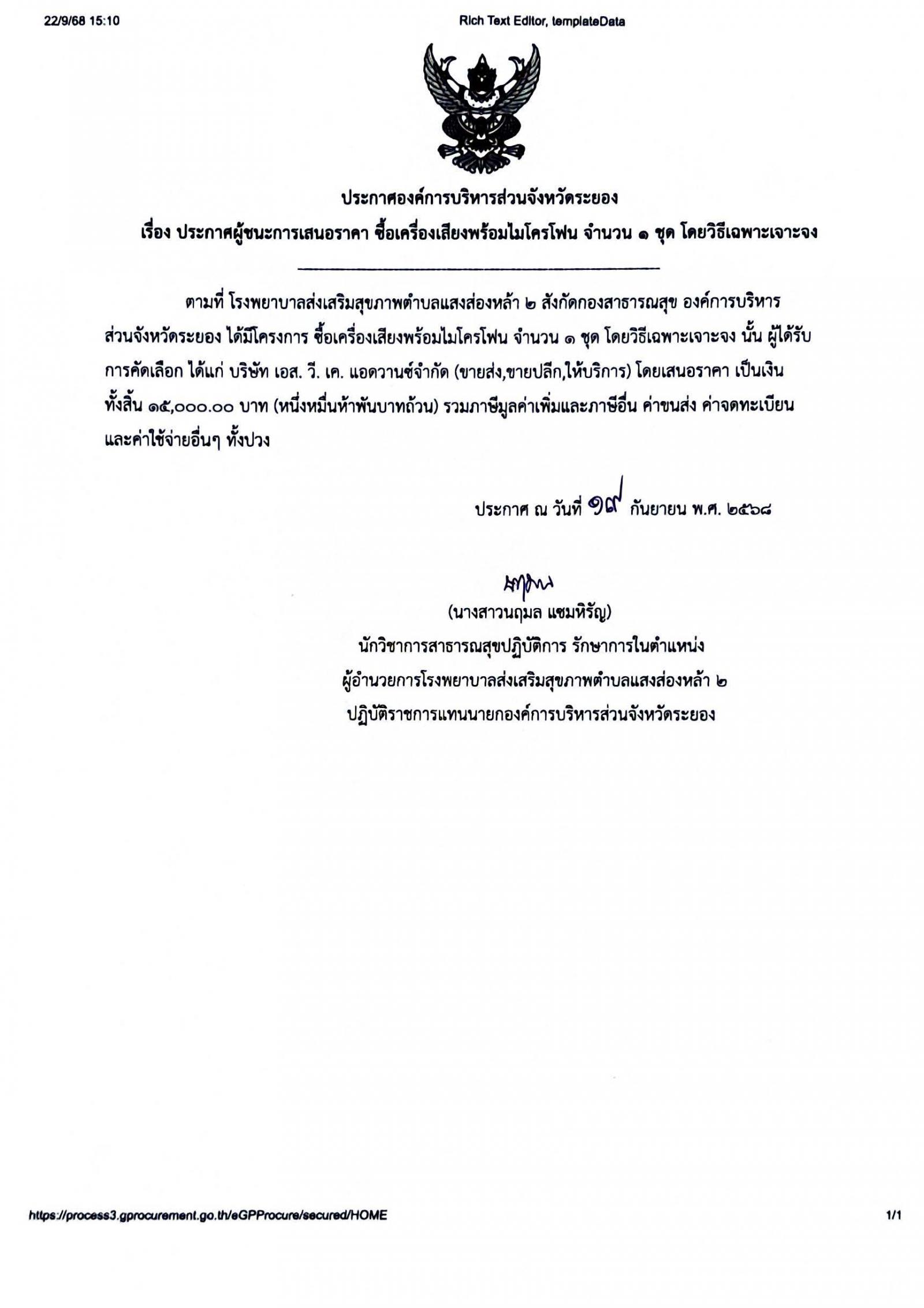 ประกาศผู้ชนะการเสนอราคา ซื้อเครื่องเสียงพร้อมไมโครโฟน จำนวน 1 ชุด โดยวิธีเฉพาะเจาะจง
