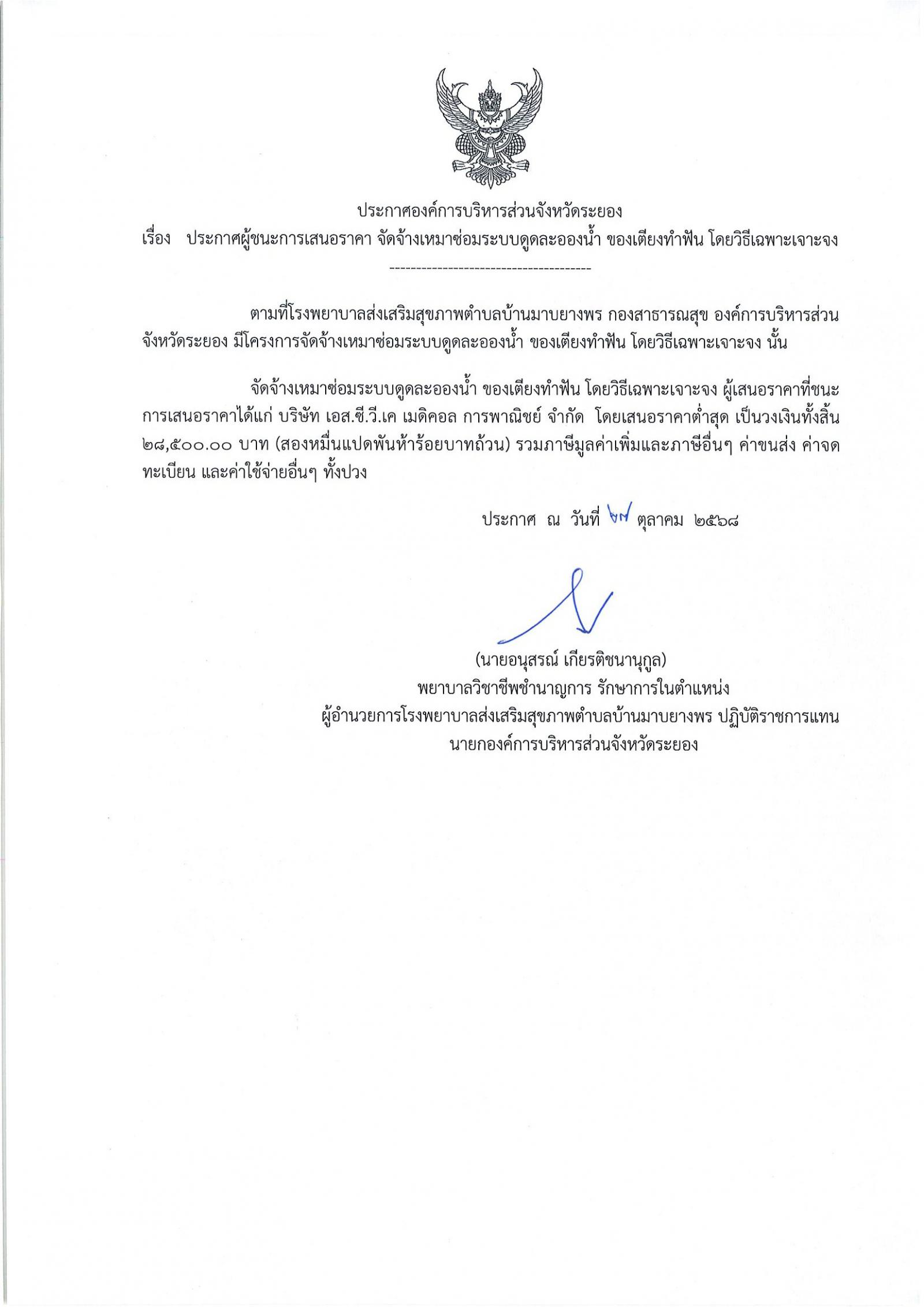 ประกาศผู้ชนะการเสนอราคา จัดจ้างเหมาซ่อมระบบดูดละอองน้ำ ของเตียงทำฟัน โดยวิธีเฉพาะเจาะจง