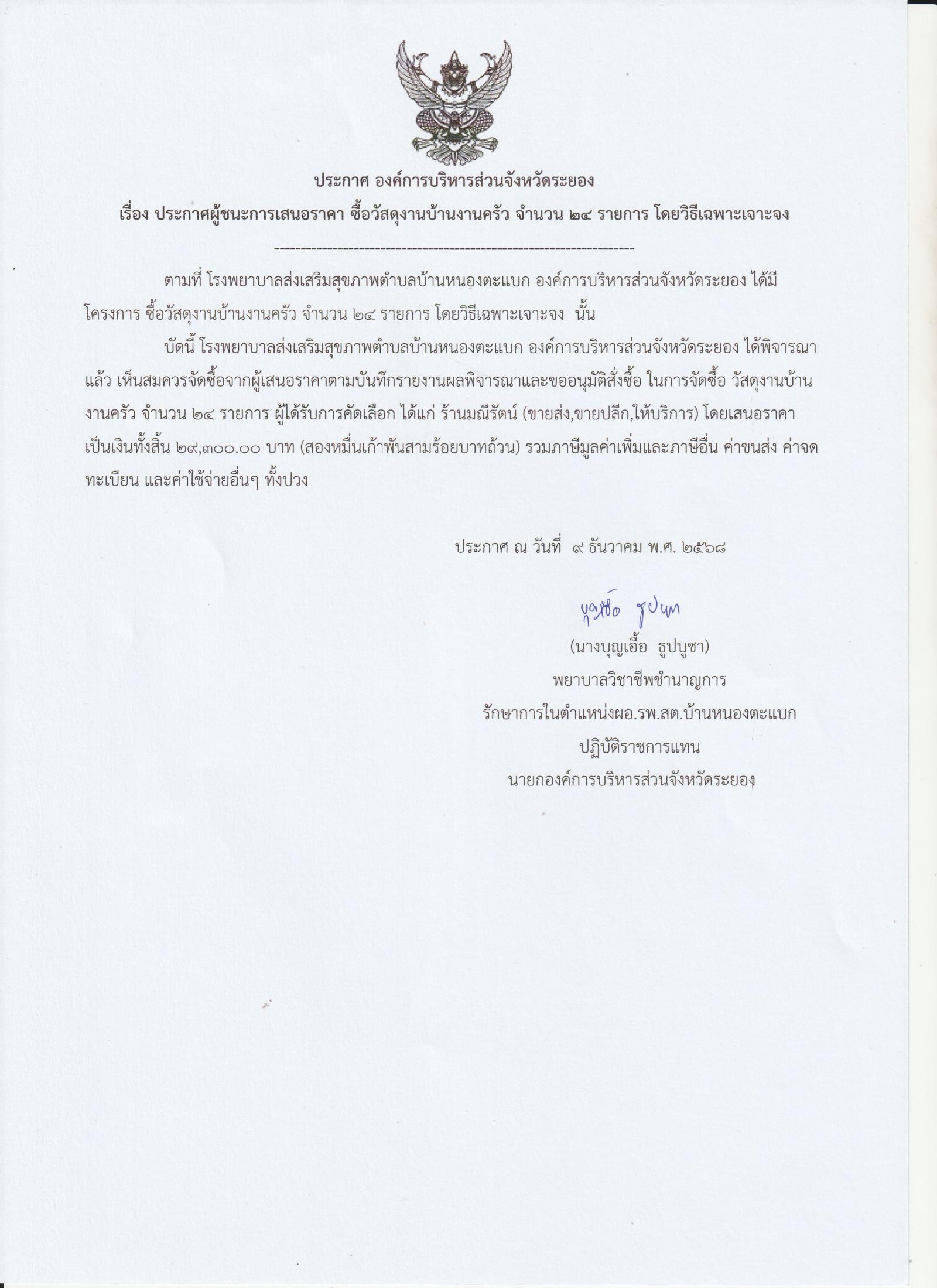 ประกาศผู้ชนะการเสนอราคา ซื้อวัสดุงานบ้านงานครัว จำนวน 24 รายการ โดยวิธีเฉพาะเจาะจง