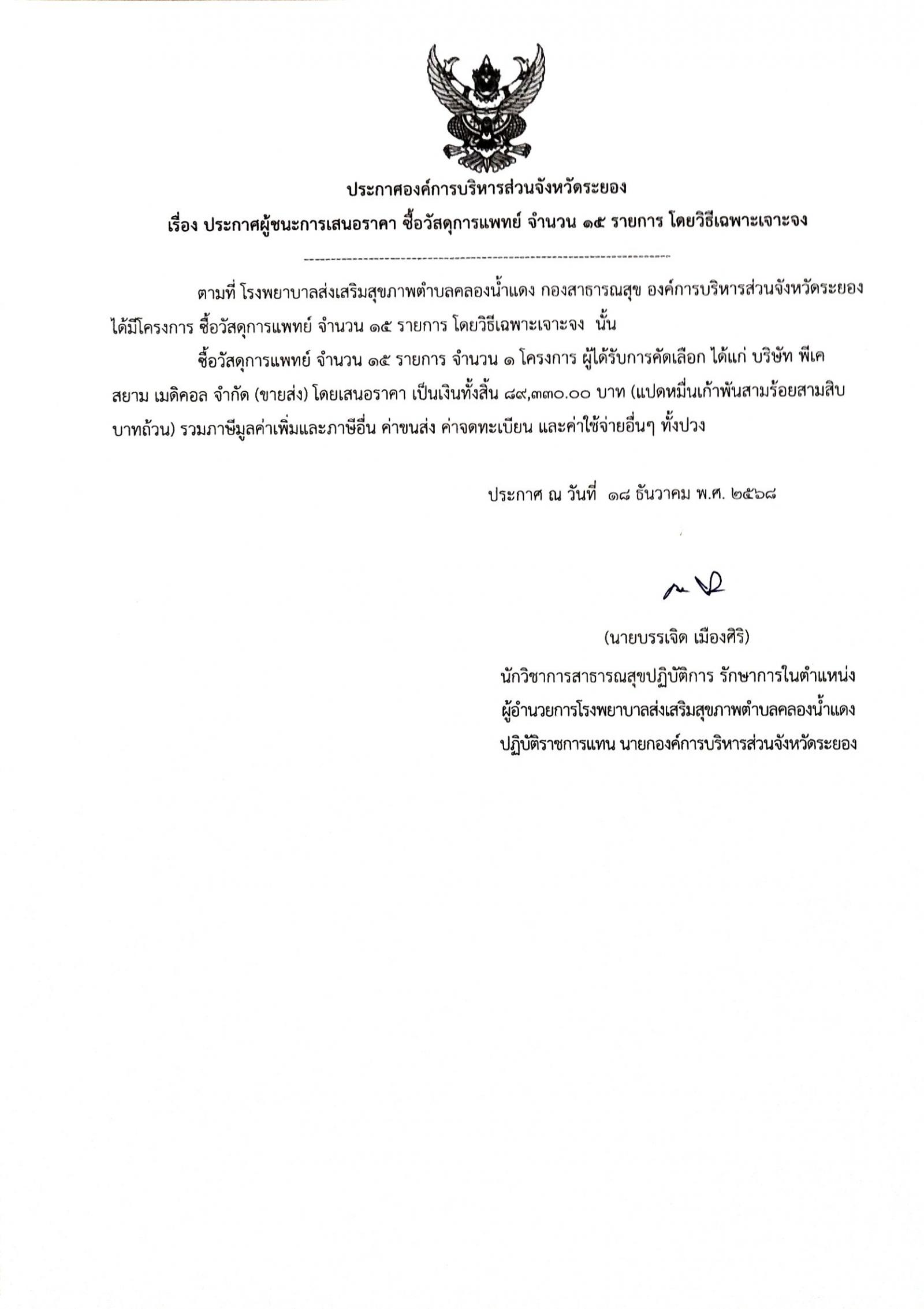 ประกาศผู้ชนะการเสนอราคา ซื้อวัสดุการแพทย์ จำนวน 15 รายการ โดยวิธีเฉพาะเจาะจง