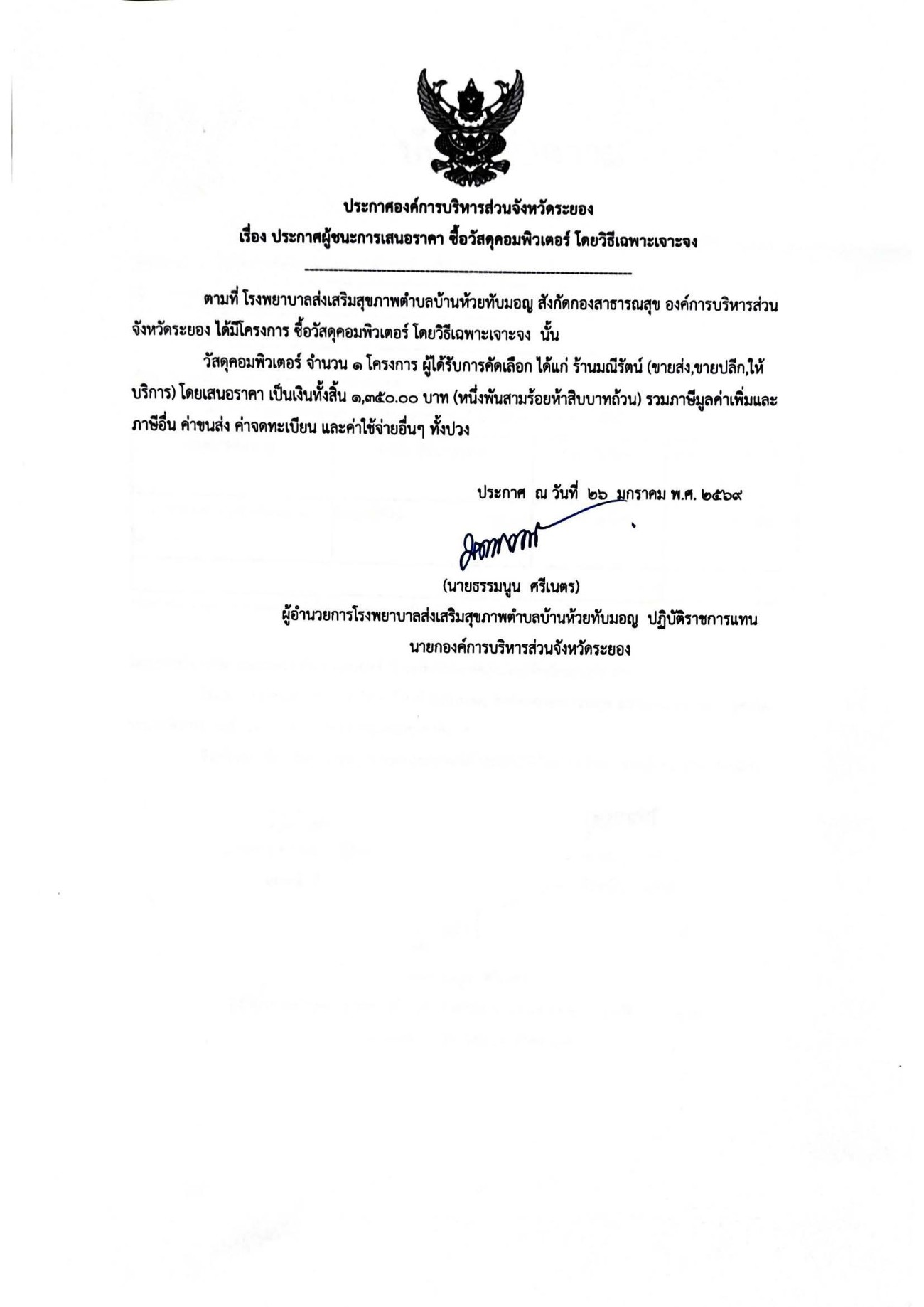 ประกาศผู้ชนะการเสนอราคา ซื้อวัสดุคอมพิวเตอร์ โดยวิธีเฉพาะเจาะจง