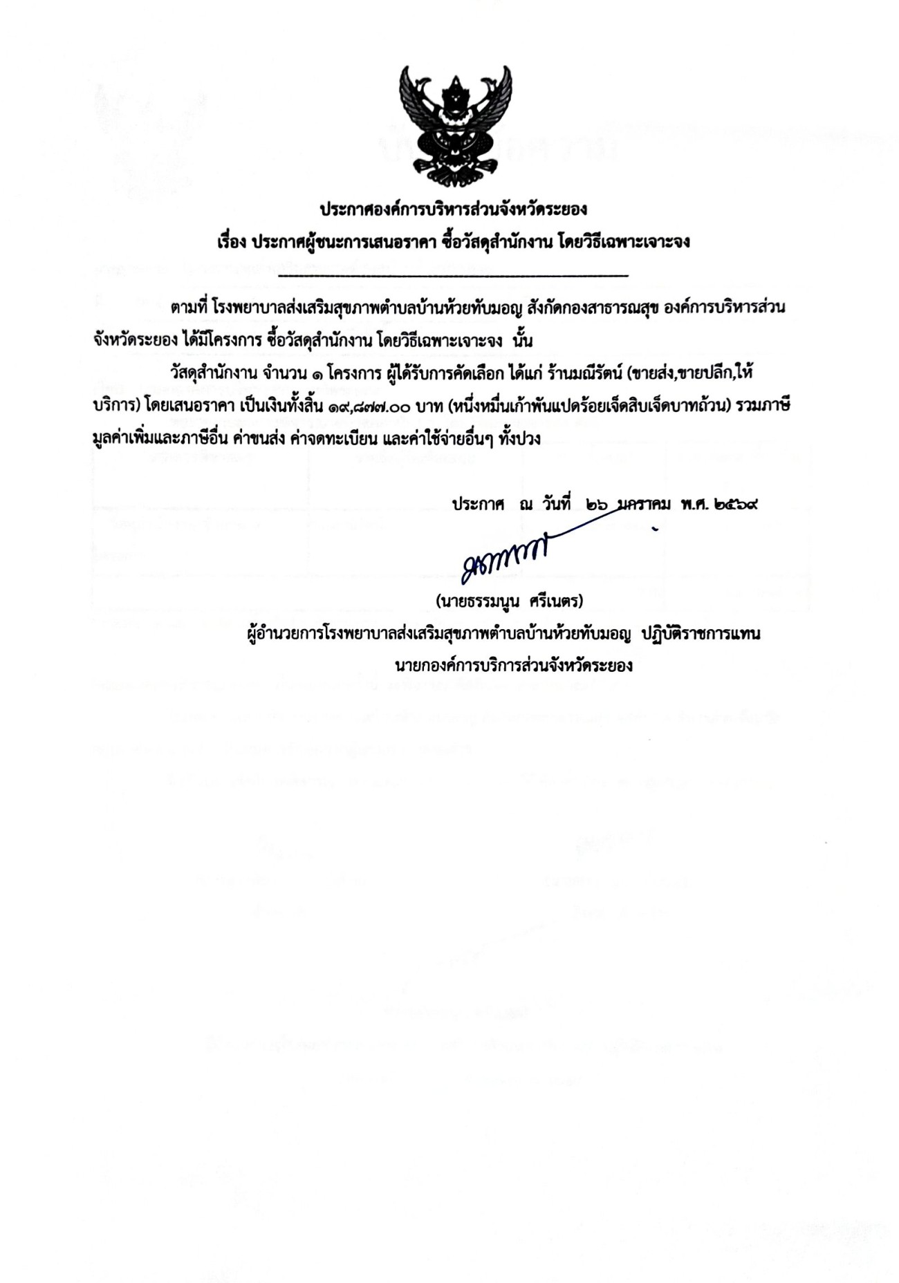 ประกาศผู้ชนะการเสนอราคา ซื้อวัสดุสำนักงาน โดยวิธีเฉพาะเจาะจง