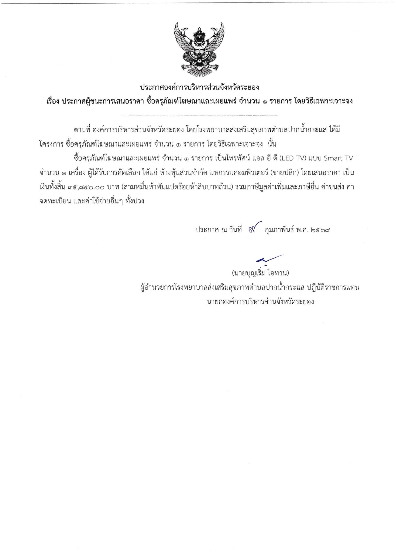 ประกาศผู้ชนะเสนอราคา ซื้อครุภัณฑ์โฆษณาและเผยแพร่ จำนวน 1 รายการ โดยวิธีเฉพาะเจาะจง