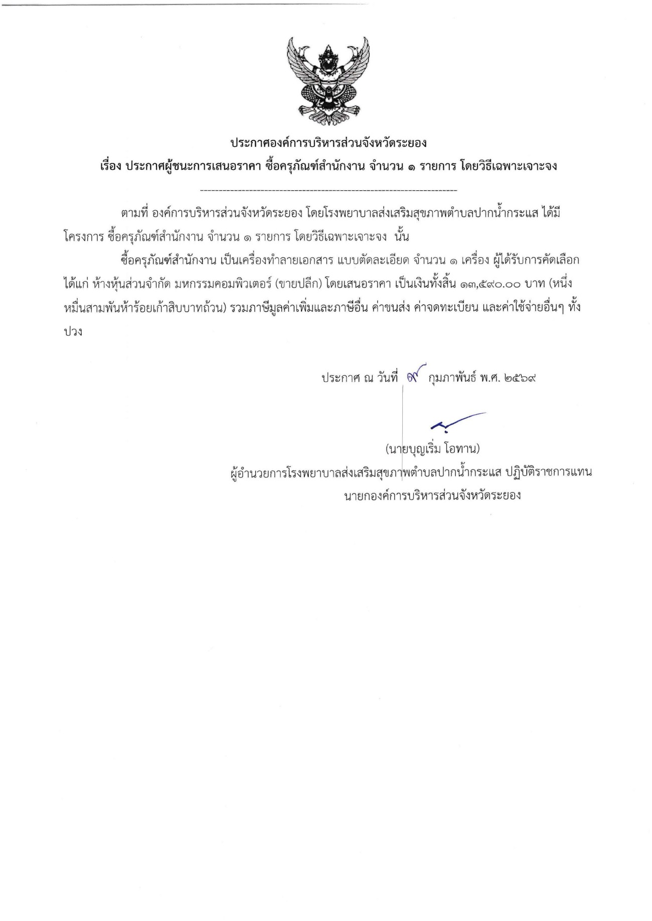 ประกาศผู้ชนะเสนอราคา ซื้อครุภัณฑ์สำนักงาน จำนวน 1 รายการ โดยวิธีเฉพาะเจาะจง