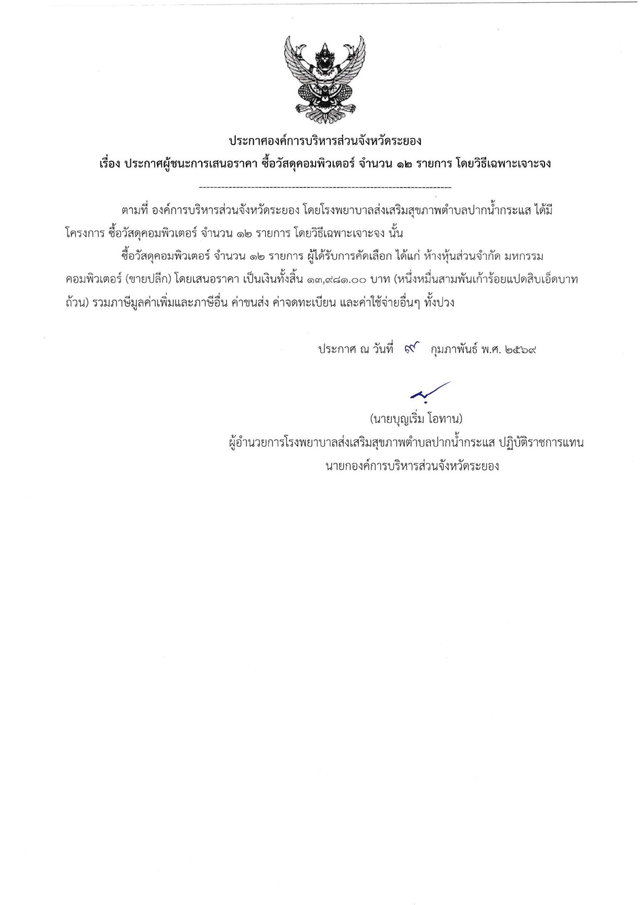 ประกาศผู้ชนะเสนอราคา ซื้อวัสดุคอมพิวเตอร์ จำนวน 12 รายการ โดยวิธีเฉพาะเจาะจง