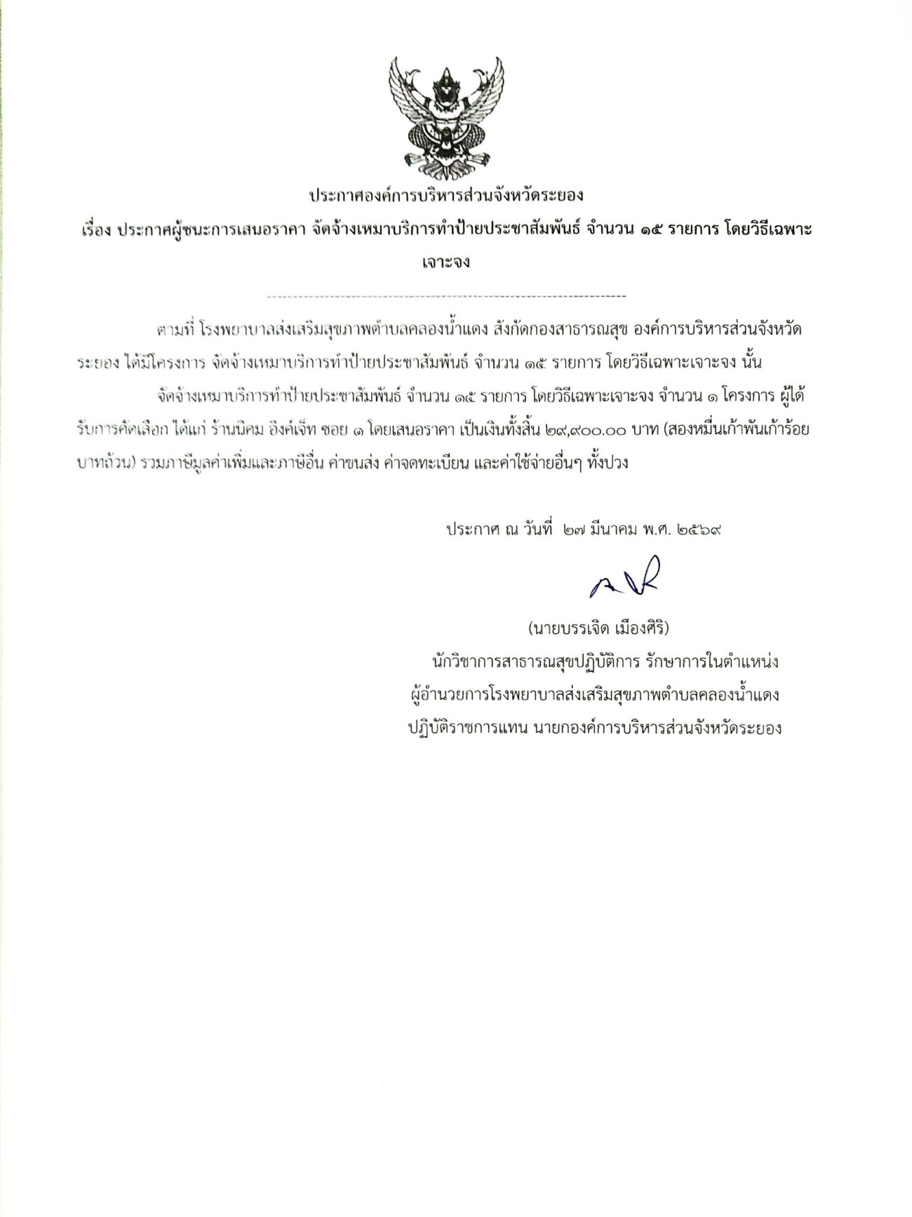 ประกาศผู้ชนะเสนอราคา จัดจ้างเหมาบริการทำป้ายประชาสัมพันธ์ จำนวน 15 รายการ โดยวิธีเฉพาะเจาะจง