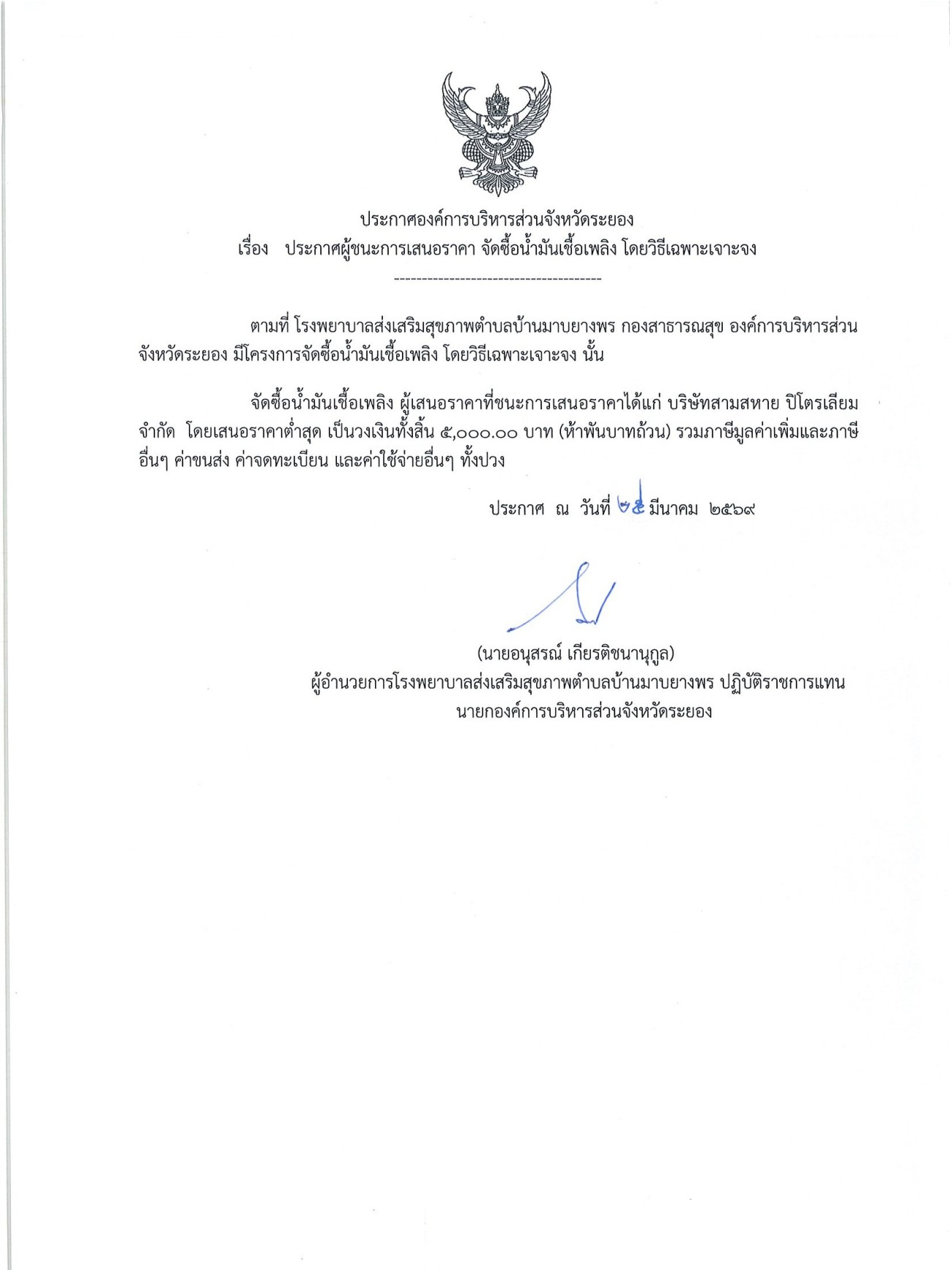 ประกาศผู้ชนะเสนอราคา จัดซื้อน้ำมันเชื้อเพลิง โดยวิธีเฉพาะเจาะจง