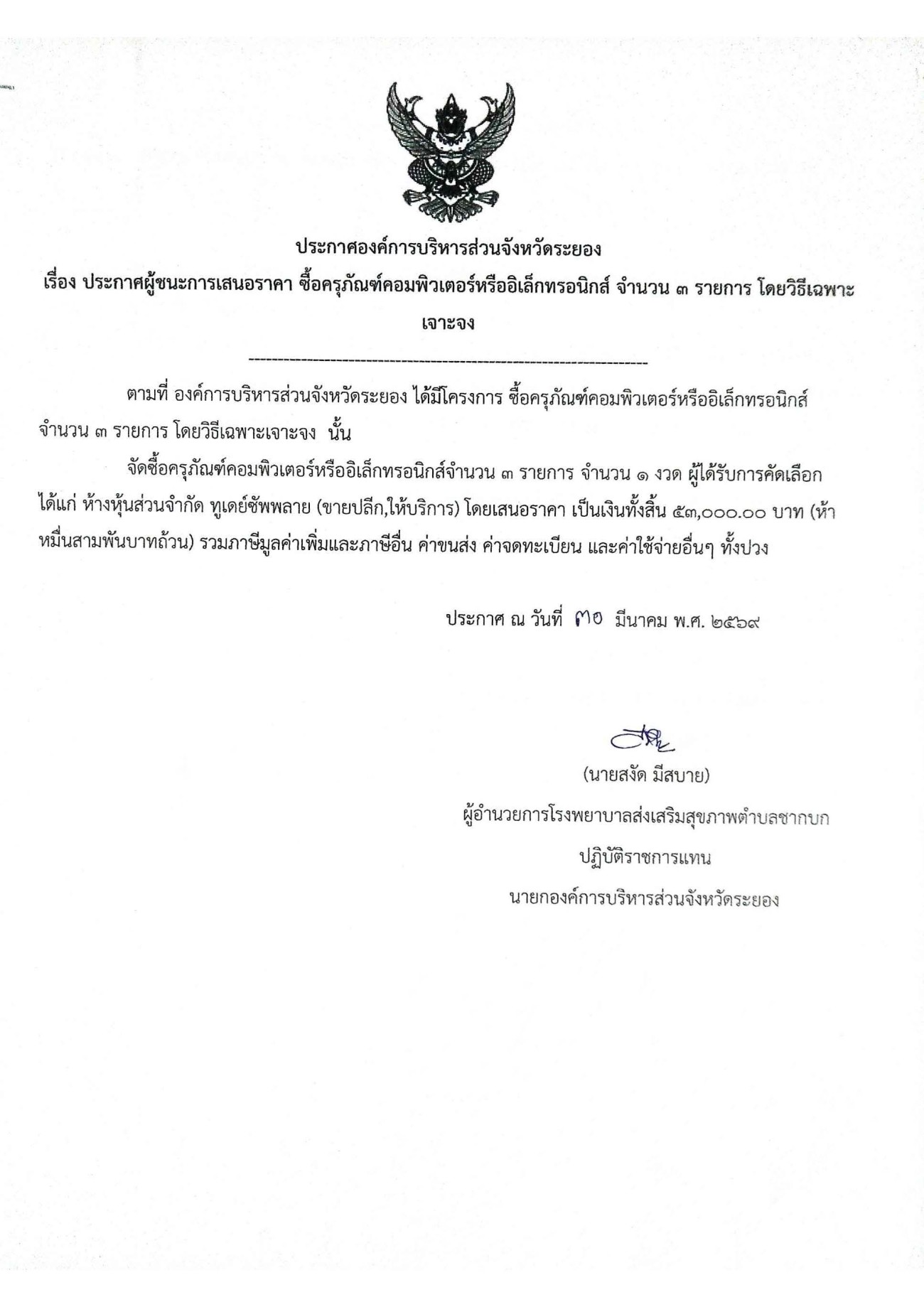 ประกาศผู้ชนะเสนอราคา ซื้อครุภัณฑ์คอมพิวเตอร์หรืออิเล็กทรอนิกส์ จำนวน 3 รายการ โดยวิธีเฉพาะเจาะจง
