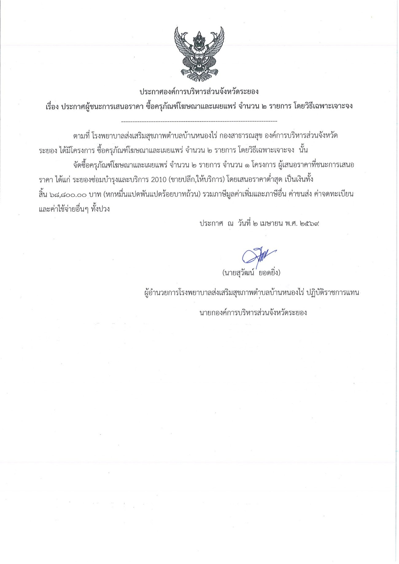 ประกาศผู้ชนะการเสนอราคา จัดซื้อครุภัณฑ์โฆษณาและเผยแพร่ จำนวน 2 รายการ โดยวิธีเฉพาะเจาะจง