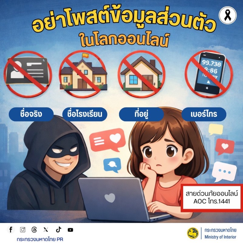 อันตรายกว่าที่คิด ! อย่าโพสต์ข้อมูลส่วนตัวในโลกออนไลน์ พบเห็นแจ้ง AOC โทร.1441