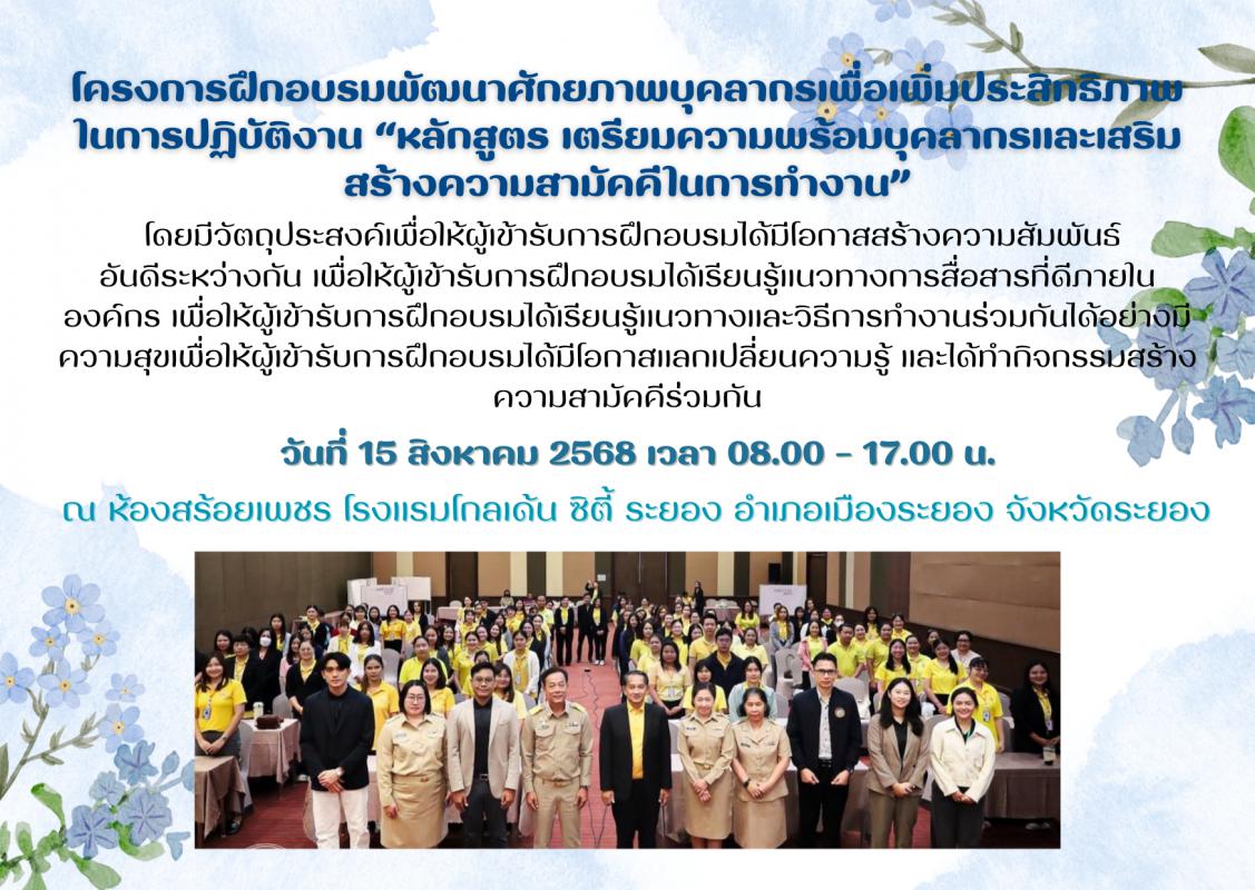โครงการฝึกอบรมพัฒนาศักยภาพบุคลากรเพื่อเพิ่มประสิทธิภาพในการปฏิบัติงาน “หลักสูตร เตรียมความพร้อมบุคลากรและเสริมสร้างความสามัคคีในการทำงาน” วันที่ 15 สิงหาคม 2568 เวลา 08.00 – 17.00 น. ณ ห้องสร้อยเพชร โรงแรมโกลเด้น ซิตี้ ระยอง อำเภอเมืองระยอง จังหวัดระยอง 15 สิงหาคม 2568 313