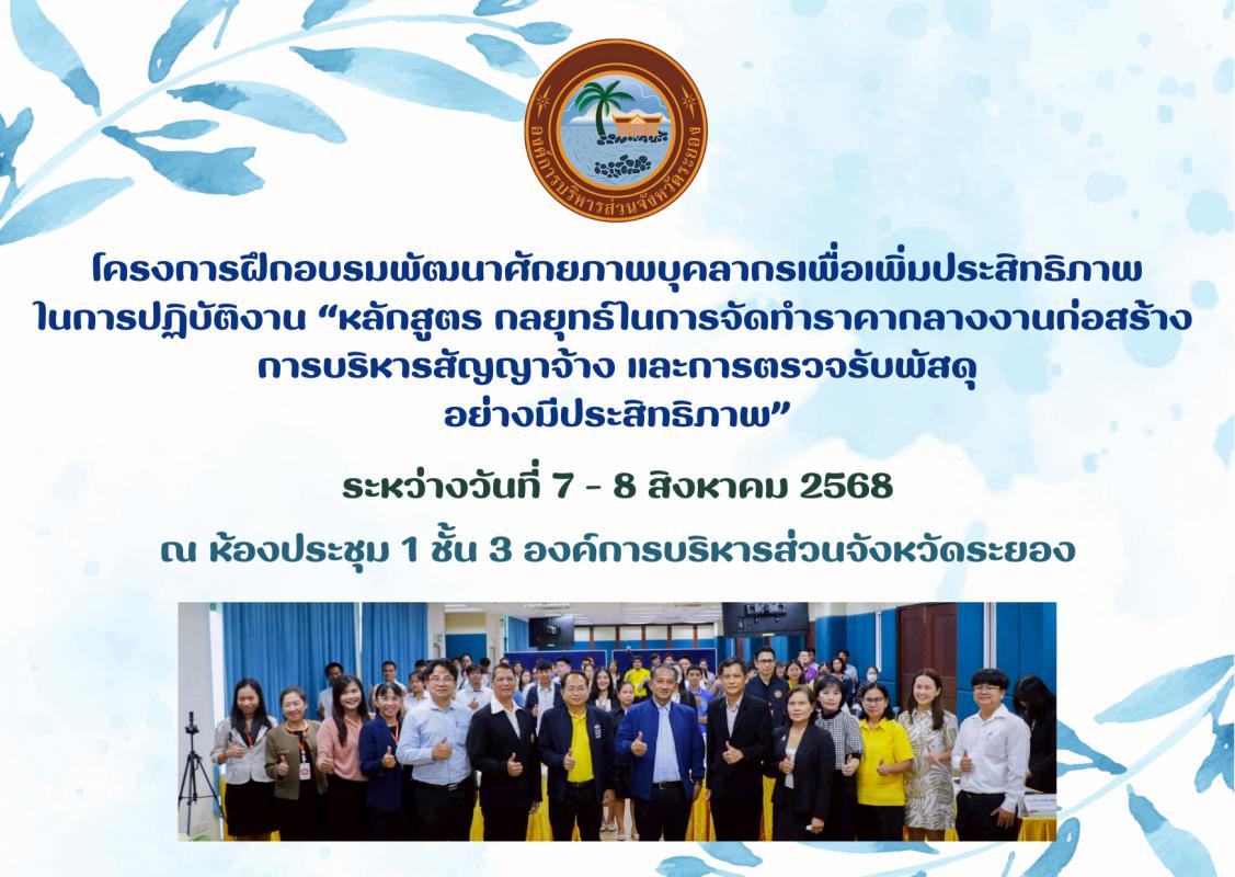โครงการฝึกอบรมพัฒนาศักยภาพบุคลากรเพื่อเพิ่มประสิทธิภาพในการปฏิบัติงาน “หลักสูตร กลยุทธ์ในการจัดทำราคากลางงานก่อสร้าง การบริหารสัญญาจ้าง และการตรวจรับพัสดุอย่างมีประสิทธิภาพ” ระหว่างวันที่ 7 - 8 สิงหาคม 2568 เวลา 08.00 – 17.00 น. ณ ห้องประชุม 1 ชั้น 3 องค์การบริหารส่วนจังหวัดระยอง 8 สิงหาคม 2568 306