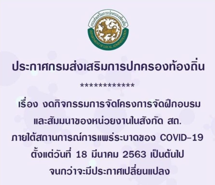 งดกิจกรรมการจัดโครงการฝึกอบรมและสัมมนาภายใต้สถานการณ์การแพร่ระบาดของโรคไวรัสติดเชื้อไวรัสโคโรนา 2019 (COVID-19) 24 มีนาคม 2563 249