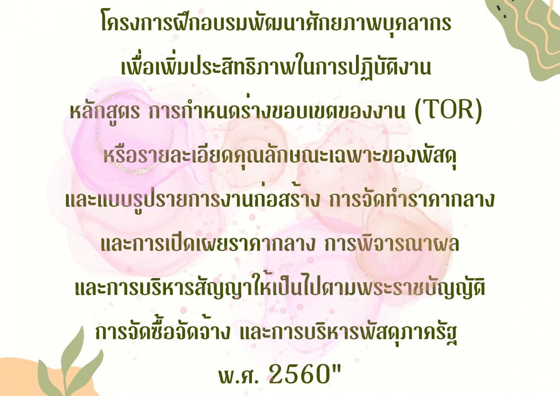 โครงการฝึกอบรมพัฒนาศักยภาพบุคลากร เพื่อเพิ่มประสิทธิภาพในการปฏิบัติงาน หลักสูตร การกำหนดร่างขอบเขตของงาน (TOR) หรือรายละเอียดคุณลักษณะเฉพาะของพัสดุและแบบรูปรายการงานก่อสร้าง การจัดทำราคากลางและการเปิดเผยราคากลาง ฯ 30 มกราคม 2566 583