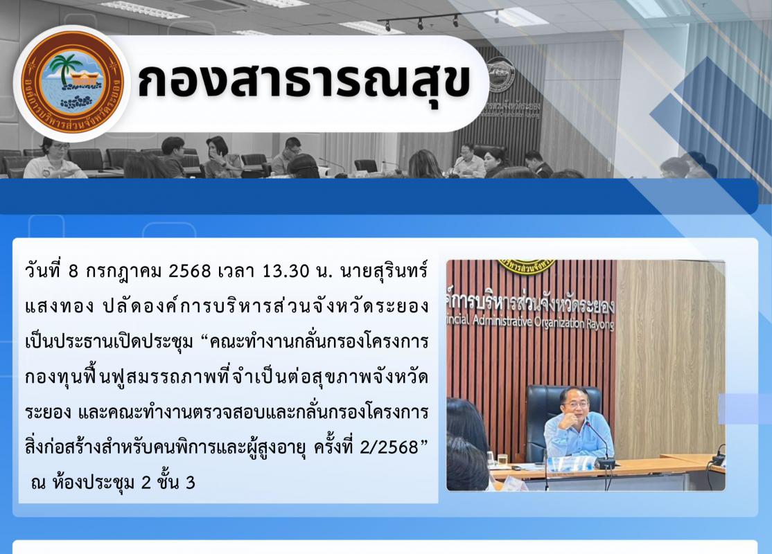 ประชุมคณะทำงานกลั่นกรองโครงการกองทุนฟื้นฟูสมรรถภาพที่จำเป็นต่อสุขภาพจังหวัดระยอง และคณะทำงานตรวจสอบและกลั่นกรองโครงการสิ่งก่อสร้างสำหรับคนพิการและผู้สูงอายุ ครั้งที่ 2/2568 8 กรกฏาคม 2568 225