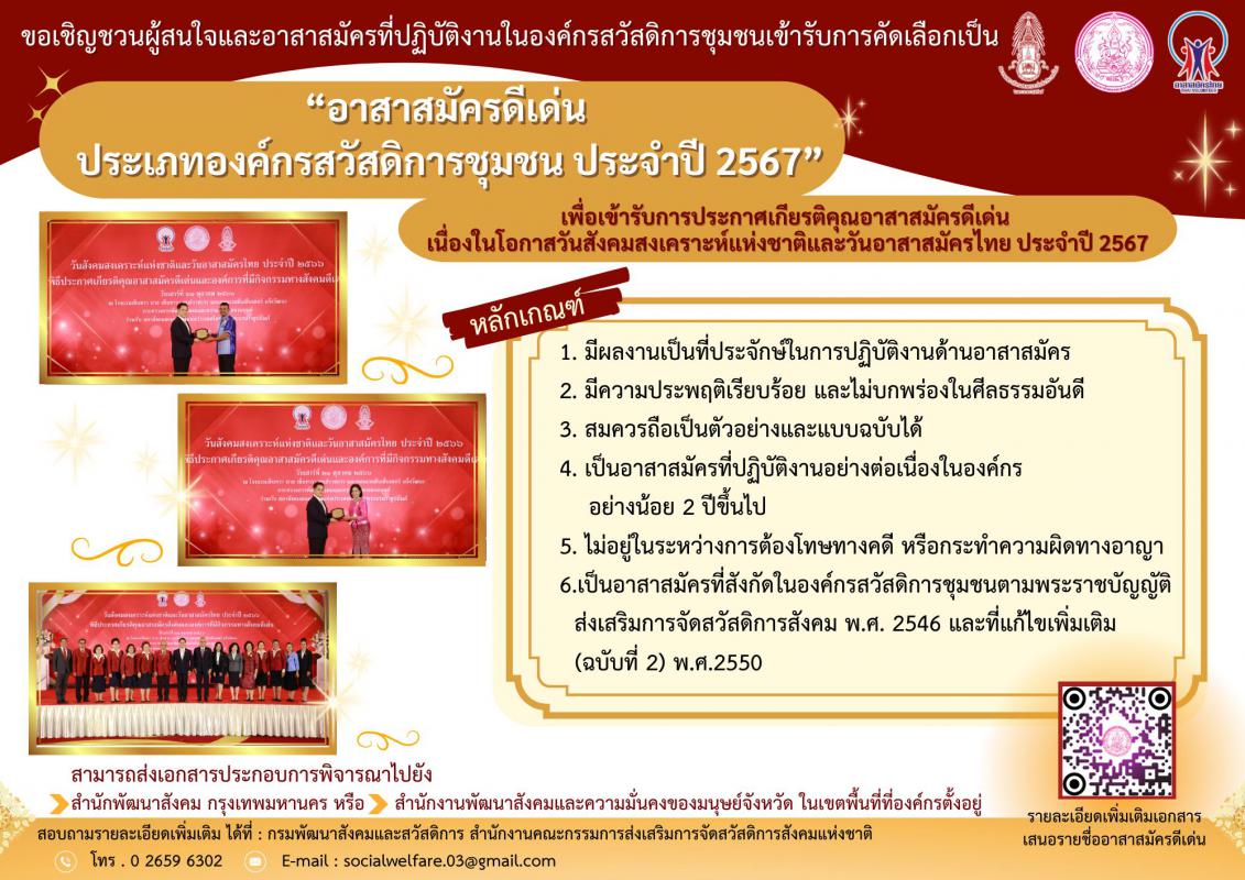 ขอความร่วมมือประชาสัมพันธ์การคัดเลือกอาสาสมัครดีเด่นประเภทองค์กรสวัสดิการชุมชน ประจำปี ๒๕๖๗ 14 มีนาคม 2567 541