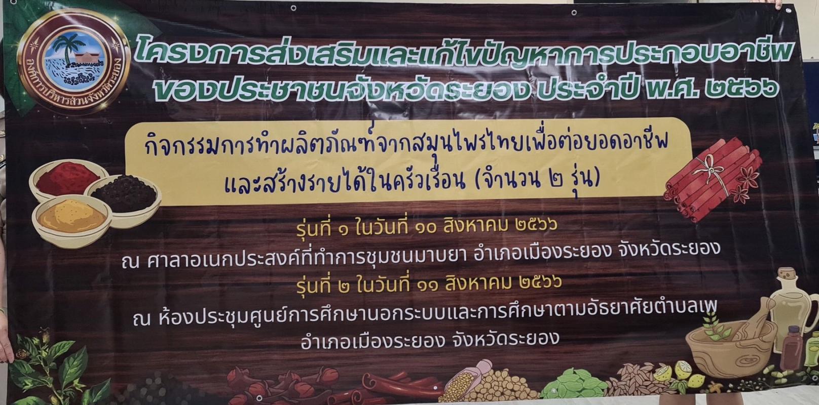 ขอเชิญเข้าร่วมโครงการส่งเสริมและแก้ไขปัญหาการประกอบอาชีพของประชาชนจ.ระยอง ประจำปี พ.ศ.2566 "กิจกรรมการทำผลิตภัณฑ์จากสมุนไพรไทยเพื่อต่อยอดอาชีพและสร้างรายได้ในครัวเรือน(จำนวน 2 รุ่น)" 1 สิงหาคม 2566 893