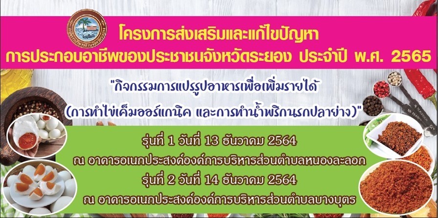 ขอเชิญเข้าร่วมโครงการส่งเสริมและแก้ไขปัญหาการประกอบอาชีพของประชาชนจ.ระยอง ประจำปีพ.ศ.2565"กิจกรรมการแปรรูปอาหารเพิ่อเพิ่มรายได้ (การทำไข่เค็มออร์แกนิคและการทำน้ำพริกนรกปลาย่าง)" 1 ธันวาคม 2564 528