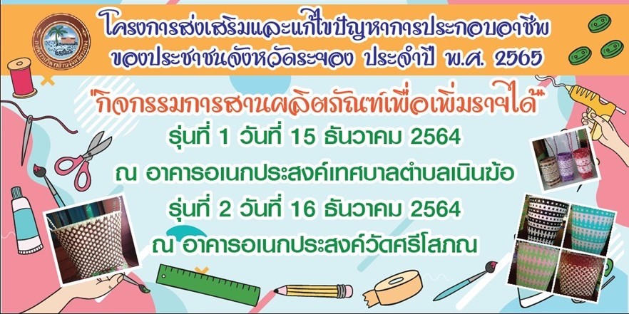 ขอเชิญเข้าร่วมโครงการส่งเสริมและแก้ไขปัญหาการประกอบอาชีพของประชาชนจ.ระยอง ประจำปี พ.ศ.2565 "กิจกรรมการสานผลิตภัณฑ์เพื่อเพิ่มรายได้" 1 ธันวาคม 2564 607