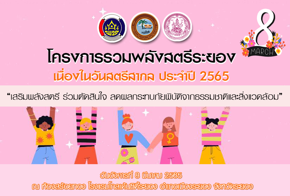 ขอเชิญร่วมโครงการรมพลังสตรีระยอง เนื่องในวันสตรีสากลประจำปี 2565 “เสริมพลังสตรี ร่วมตัดสินใจ ลดผลกระทบภัยพิบัติจากธรรมชาติและสิ่งแวดล้อม”