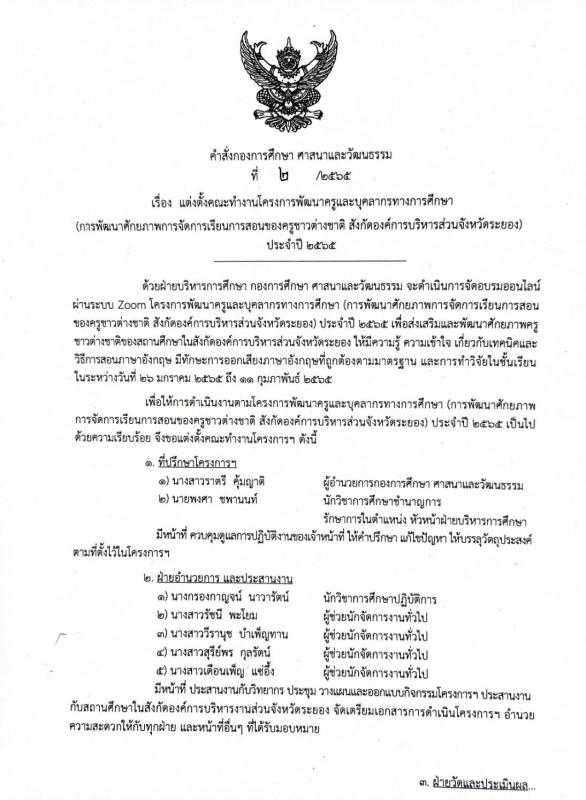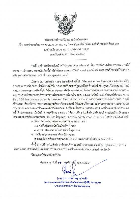 การจัดการเรียนการสอนแบบ On site ของวิทยาลัยเทคโนโลยีและอาชีวศึกษาตากสินระยองและโรงเรียนอนุบาลนานาชาติตากสินระยองภาคเรียนที่ 2 ปีการศึกษา 2564