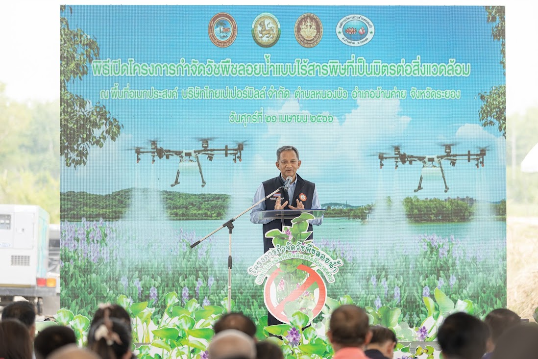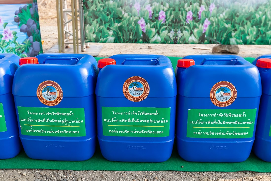 จังหวัดระยองโดยสำนักงานส่งเสริมการปกครองท้องถิ่นจังหวัดระยอง สำนักงานโยธาธิการและผังเมืองจังหวัดระยอง โครงการชลประทานระยอง และองค์การบริหารส่วนจังหวัดระยอง ร่วมมือกันจัดทำโครงการกำจัดวัชพืชลอยน้ำแบบไร้สารพิษที่เป็นมิตรต่อสิ่งแวดล้อม (zero floating weeds) โดยการอบรมให้ความรู้การใช้สารสูตรสวพ. 62-RID No.1 ที่คิดค้นโดยสำนักวิจัยและพัฒนา กรมชลประทาน ซึ่งสารดังกล่าวสามารถแก้ไขปัญหาการแพร่ระบาดของผักตบชวาได้อย่างมีประสิทธิภาพ ปราศจากกากตะกอนหลงเหลือ ไม่มีกลิ่น และปลอดภัยต่อสภาพแวดล้อม เพื่อเป็นการดูแลและฟื้นฟูแหล่งน้ำจืดในพื้นที่จังหวัดระยองให้มีความอุดมสมบูรณ์ อย่างยั่งยืน อันเป็นการบูรณาการความร่วมมือจากหน่วยงานรัฐ องค์กรปกครองส่วนท้องถิ่น และประชาชน ร่วมกันกำจัดวัชพืชลอยน้ำในแหล่งน้ำ ในพื้นที่จังหวัดระยอง ซึ่งจะช่วยปลูกฝังจิตสำนึกในการดูแลรักษาแหล่งน้ำจืด ให้แก่ประชาชน และสามารถฟื้นคืนความอุดมสมบูรณ์ของทรัพยากรน้ำต่อไป โดยได้มีการจัดทำโครงการ โดยการบรรยายความเป็นมาของสารละลาย สวพ.62-RID No.1 และสาธิตวิธีการพ่นสารละลาย สวพ.62-RID No.1 โดยอากาศยานไร้คนขับ ในวันที่ 21 เมษายน ณ พื้นที่ลานอเนกประสงค์ บริษัท ไทยเปเปอร์มิลล์ จำกัด ตำบลหนองบัว อำเภอบ้านค่าย จังหวัดระยองน 2566 เวลา 08.30 - 12.00