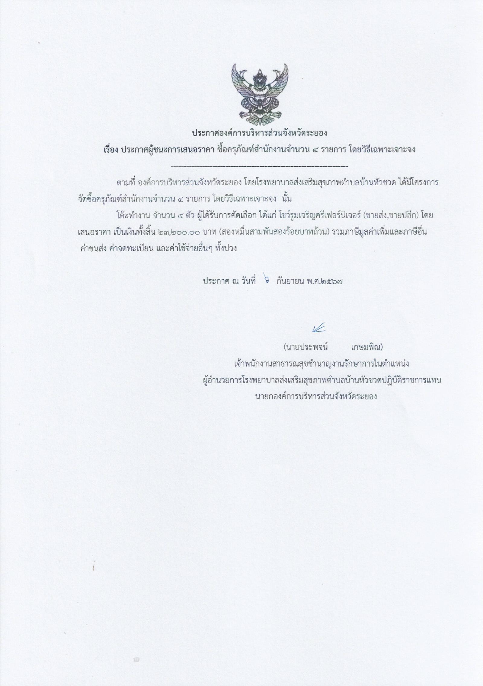 ประกาศผู้ชนะการเสนอราคา ซื้อครุภัณฑ์สำนักงานจำนวน 4 รายการ โดยวิธีเฉพาะเจาะจง