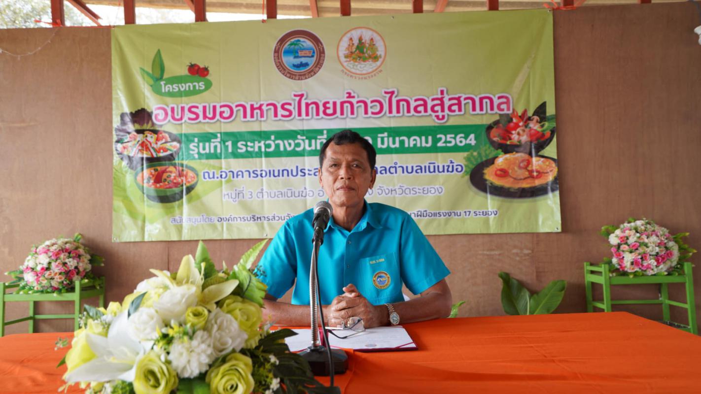วันที่ 15 มีนาคม 2564 เวลา 09.30 น. นายจรัญ ความเพียร เลขานุการนายกองค์การบริหารส่วนจังหวัดระยอง เป็นประธานเปิดโครงการอบรมอาหารไทยก้าวสู่สากล ระหว่างวันที่ 15-19 มีนาคม 2564 ณ ร้านอาหารครัวนายก ตำบลเนินฆ้อ อำเภอแกลง จังหวัดระยอง โดยมีผู้เข้าร่วมงาน อาทิ ดร.กนกวรรณ เบญจาทิกุล สมาชิกสภาองค์การบริหารส่วนจังหวัดระยอง (เป็นผู้กล่าวรายงาน) นายอรรถวุฒิ สมนึก ปลัดเทศบาลตำบลเนินฆ้อ ปฏิบัติหน้าที่แทนนายกเทศมนตรีตำบลเนินฆ้อ นางจินตนา งามสนอง นักวิชาการพัฒนาฝัมือแรงงานชำนาญการพิเศษ นางบุหรง โพธิ์วิจิตร ประธานสตรีอาสาพัฒนาตำบลเนินฆ้อ พร้อมด้วยผู้เข้ารับการอบรม จำนวน 20 ท่าน เข้าร่วมโครงการอย่างพร้อมเพรียง