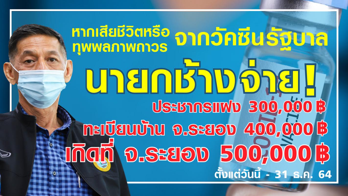 ***หมายเหตุ การบาดเจ็บ/เจ็บปวดต่อเนื่องจากการฉีดวัคซีน ต้องเกิดจากการฉีดวัดซีนที่โรงพยาบาลของรัฐ จัดหาเท่านั้น และ แพทย์ได้ทำการพิสูจน์ว่าการการบาดเจ็บ/เจ็บปวดต่อเนื่องเกิดจากการฉีดวัดซีนจริง จึงจะได้รับเงินช่วยเหลือจากท่านนายก ปิยะ ปิตุเตชะ และสำหรับประชาชนที่ไม่มีทะเบียนบ้านอยู่ใน จ.ระยอง จะตรวจสอบหลักฐานจากบัตรประกันสังคม และบัตรพนักงานแต่ก็จะต้องตรวจสอบได้ว่าอาศัยอยู่ใน จ.ระยอง และมีเงื่อนไขว่าต้องฉีดวัคซีนกับโรงพยาบาลของรัฐเท่านั้น โดยมีระยะเวลาเริ่มตั้งแต่วันนี้ – 31 ธันวาคม 2564