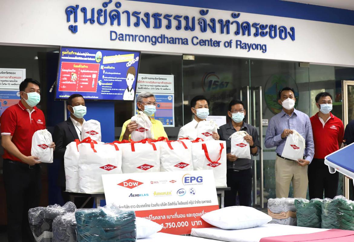 วันที่ 8 กันยายน 2564 เวลา 11.00 น. ณ ศาลากลางจังหวัดระยอง นายชาญนะ เอี่ยมแสง ผู้ว่าราชการจังหวัดระยอง ว่าที่ร้อยตรีพิรุณ เหมะรักษ์ รองผู้ว่าราชการจังหวัดระยอง นายกิตติ เกียรติ์มนตรี รองนายกองค์การบริหารส่วนจังหวัดระยอง (1) เข้ารับมอบสนับสนุนเตียงสนามแอร์โรคลาส เบาะที่นอน และชุดเครื่องนอน จำนวน 200 ชุด มูลค่า 1,750,000 บาท จากกลุ่มบริษัท ดาว ประเทศไทย ร่วมกับ บริษัท อีสเทิร์น โพลิเมอร์ กรุ๊ป จำกัด (มหาชน) เพื่อนำไปใช้รองรับผู้ป่วยติดเชื้อโควิด-19 ที่เข้ารับการรักษาในโรงพยาบาลสนามในจังหวัดระยอง