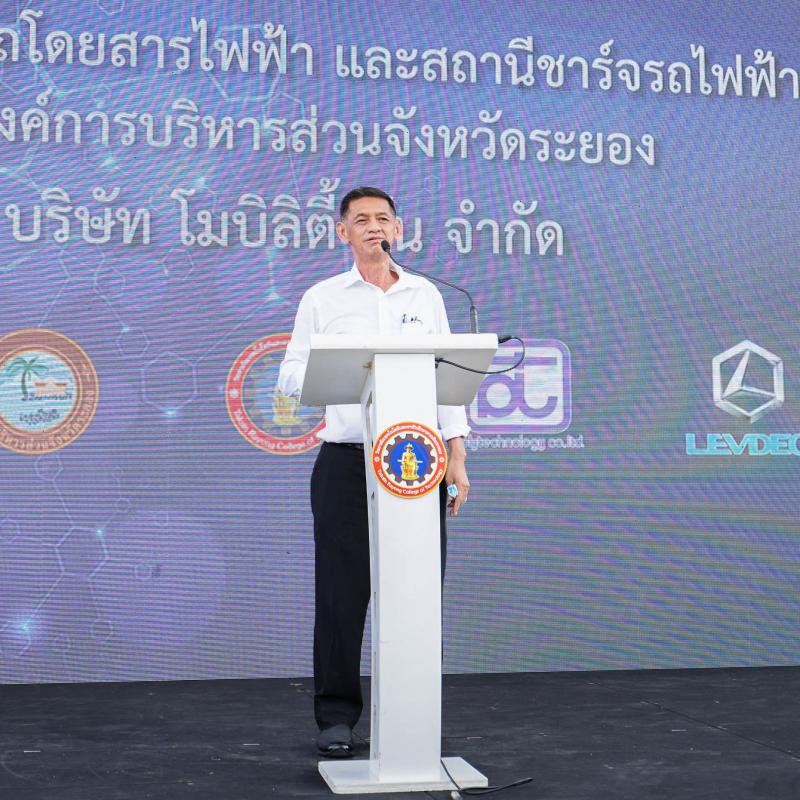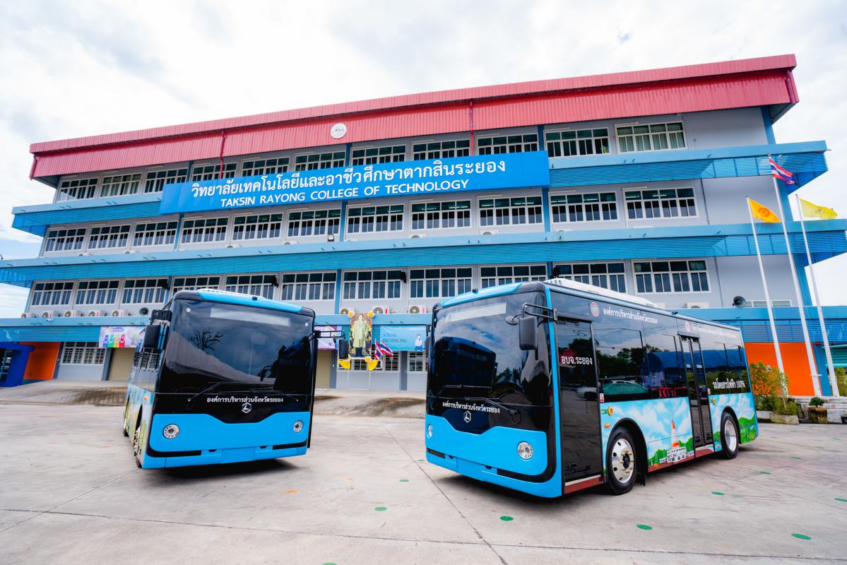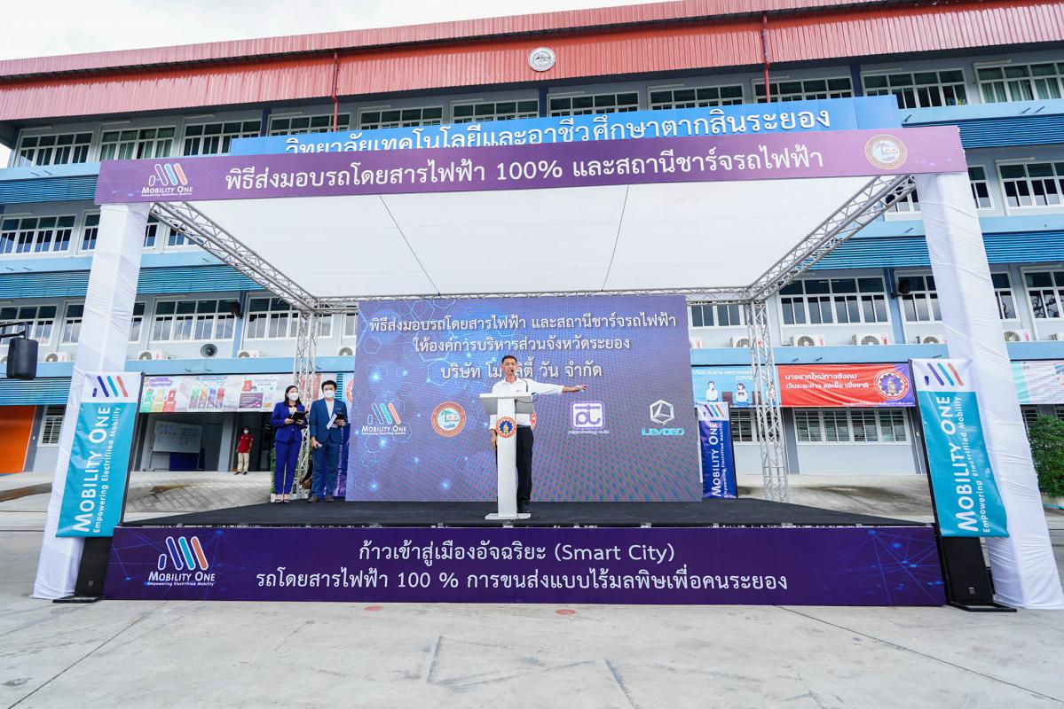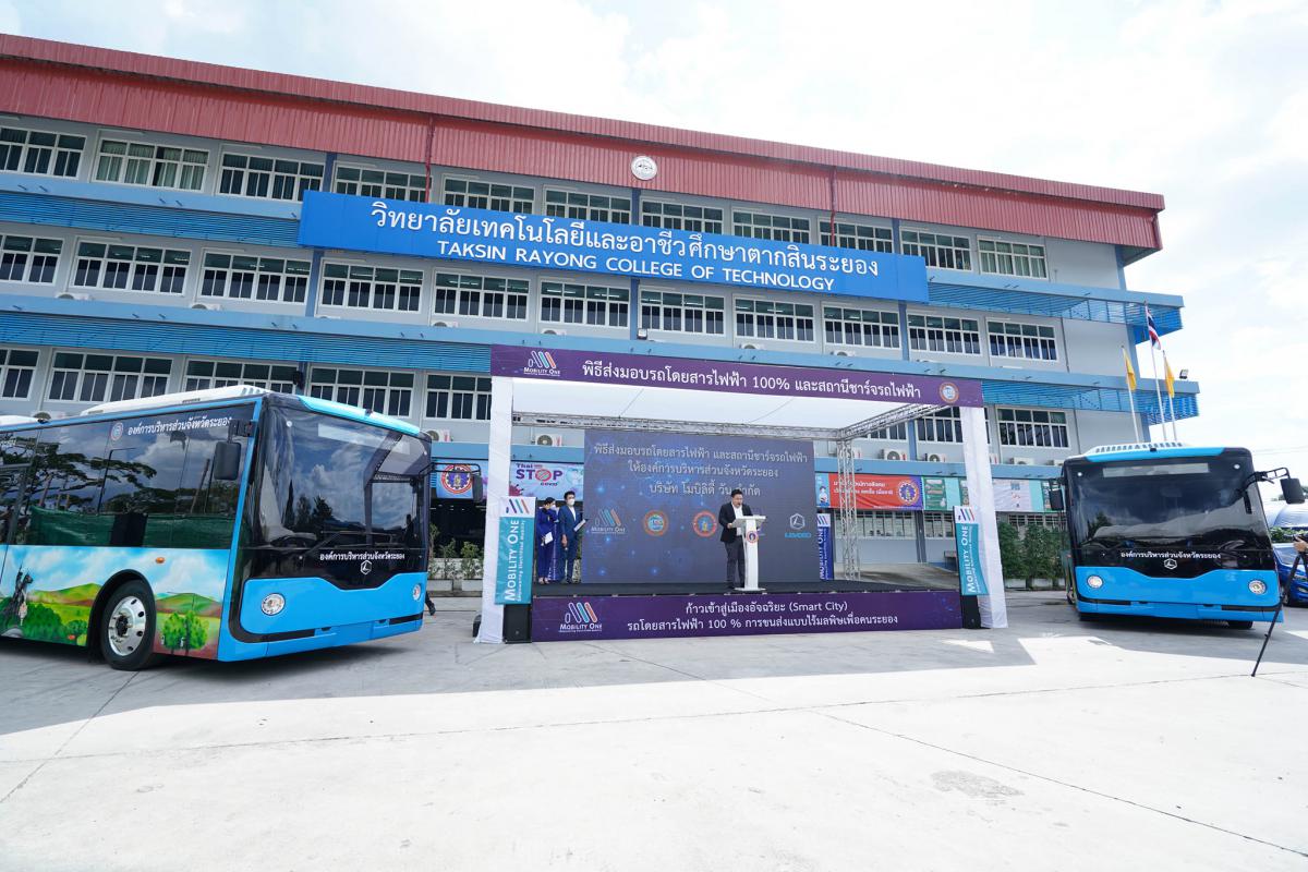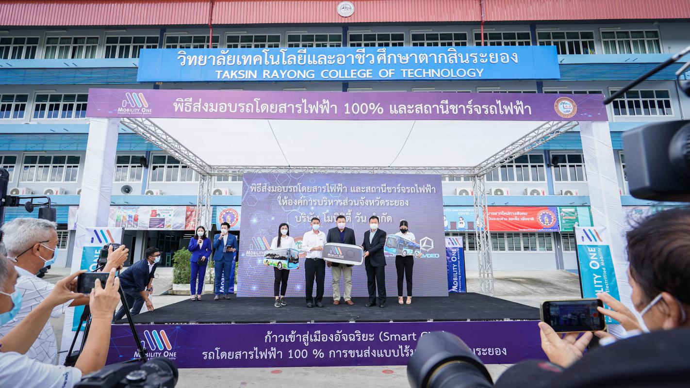 วันที่ 16 พฤศจิกายน 2564 เวลา 13.30 น. ณ วิทยาลัยเทคโนโลยีและอาชีวศึกษาตากสินระยอง นายปิยะ ปิตุเตชะ นายกองค์การบริหารส่วนจังหวัดระยอง เข้ารับมอบรถโดยสารไฟฟ้า ราคาประมาณ 15 ล้านบาท พร้อมสถานีชาร์จรถไฟฟ้า จาก บริษัท โมบิลิตี้วัน จำกัด โดยนายสมศักดิ์ พะเนียงทอง กรรมการผู้จัดการ บริษัท โมบิลิตี้วัน จำกัด ได้ทำการส่งมอบรถโดยสารไฟฟ้า จำนวน 2 คัน พร้อมสถานีชาร์จรถไฟฟ้าให้กับทางองค์การบริหารส่วนจังหวัดระยอง เพื่อนำไปใช้ในการศึกษาของวิทยาลัยเทคโนโลยีและอาชีวศึกษาตากสินระยอง รถโดยสารไฟฟ้า แบบ Ciy bus ใช้พลังงานไฟฟ้า 100% มีขนาด 8.1 เมตร จำนวน 23 ที่นั่ง ระยะทางวิ่งสูงสุด 230 กิโลเมตร เป็นรถที่มีเทคโนโลยีระบบอัจฉริยะทั้งคัน มีความคล่องตัว มีระบบกล้อง 360 องศารอบคัน เพื่อความปลอดภัยสำหรับคนขับและผู้โดยสาร นอกจากนี้ทางบริษัทฯ ยังได้ติดตั้งสถานีชาร์จสำหรับรถไฟฟ้าอีกด้วย โดยเป็นระบบชาร์จเร็ว DC(Fast Charge) ขนาด 140 กิโลวัตต์ จำนวน 2 หัวจ่าย ใช้เวลาชาร์จเพียง 1 ชั่วโมง ติดตั้งบริเวณหน้าอาคารเรียนวิทยาลัยเทคโนโลยีและอาชีวศึกษาตากสินระยอง เพื่อความสะดวกแก่ผู้ใช้งาน