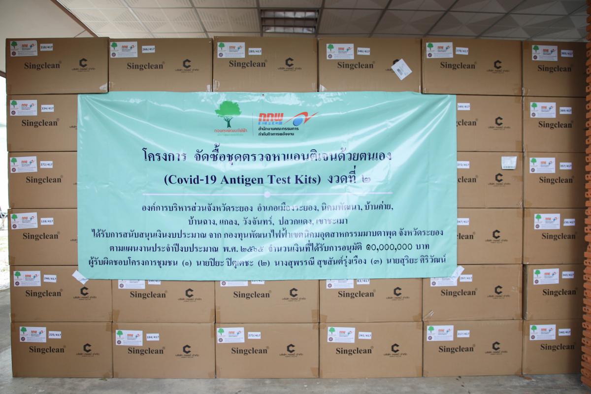 วันที่ 6 มิถุนายน 2565 เวลา 14.00 น. อบจ.ระยอง ร่วมกับ กองทุนพัฒนาไฟฟ้าเขตนิคมอุตสาหกรรมมาบตาพุด จังหวัดระยอง มอบชุดตรวจหาแอนติเจนด้วยตนเอง (Covid-19 Antigen Test Kits) งวดที่ 2 เพื่อใช้ในการป้องกันและควบคุมการแพร่ระบาดของโรคติดเชื้อไวรัสโคโรนา 2019 (COVID-19) ในจังหวัดระยอง เป็นเงิน 10,000,000 บาท โดยมอบหมายให้องค์การบริหารส่วนจังหวัดระยองดำเนินการแจกจ่ายให้กับหน่วยงานของรัฐภายในจังหวัดระยอง เพื่อนำไปใช้ให้เกิดประโยชน์แก่ประชาชนต่อไป โดยมีนางสุพรรณี สุขสันต์รุ่งเรือง ปลัดอบจ.ระยอง, นายสุริยะ ศิริวัฒน์ รก.ผอ.กองสาธารณสุข, นางศุภลักษณ์ มงคลฉัตร หัวหน้าฝ่ายบริหารงานทั่วไป, นายภิรมย์ ชาลวัลย์ คณะกรรมการพัฒนาชุมชนในพื้นที่รอบโรงไฟฟ้า(คพรฟ.) และนายแพทย์สุนทร เหรียญภูมิการกิจ นายแพทย์สาธารณสุขจังหวัดระยอง ร่วมเป็นคณะกรรมการตรวจรับและส่งมอบชุดตรวจหาแอนติเจนด้วยตนเอง (Covid-19 Antigen Test Kits) ดังกล่าวให้กับหน่วยงานต่างๆ ประกอบด้วยองค์กรปกครองส่วนท้องถิ่นต่างๆและสำนักงานสาธารณสุขจังหวัดระยองต่อไป