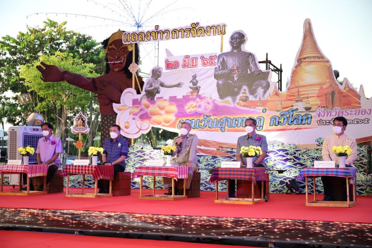 วันที่ 20 มิถุนายน 2565 เวลา 17.30 น. ณ บริเวณอนุสาวรีย์สุนทรภู่ ต.กร่ำ อ.แกลง จ.ระยอง นายชาญนะ เอี่ยมแสง ผู้ว่าราชการจังหวัดระยอง เป็นประธานงานแถลงข่าวการจัดงานวันสุนทรภู่ กวีโลก จังหวัดระยอง ประจำปี 2565 พร้อมด้วย นายอนันต์ นาคนิยม รองผู้ว่าราชการจังหวัดระยอง โดยมี นายประสานต์ พฤกษาชาติ รองนายกองค์การบริหารส่วนจังหวัดระยอง (2), นางกนกวรรณ เบญจาทิกุล สมาชิกสภาองค์การบริหารส่วนจังหวัดระยอง เขตอำเภอแกลง, นางสาวราตรี คุ้มญาติ ผู้อำนวยการกองการศึกษา ศาสนาและวัฒนธรรม, นายวรวุฒิ ด่านสมพงศ์ วัฒนธรรมจังหวัดระยอง, นายคเชนทร์ แจ่มใส นายกเทศมนตรีตำบลสุนทรภู่, นายวัชรพล สานสอน ผู้อำนวยการสำนักงานการท่องเที่ยวจังหวัดระยอง, นายทิม บุญรอด ประธานสภาวัฒนธรรมจังหวัดระยอง ตัวแทนจากหน่วยงานภาคเอกชนอื่นๆ และผู้ที่เกี่ยวข้องเข้าร่วมงานแถลงข่าวโดยพร้อมเพรียงกัน