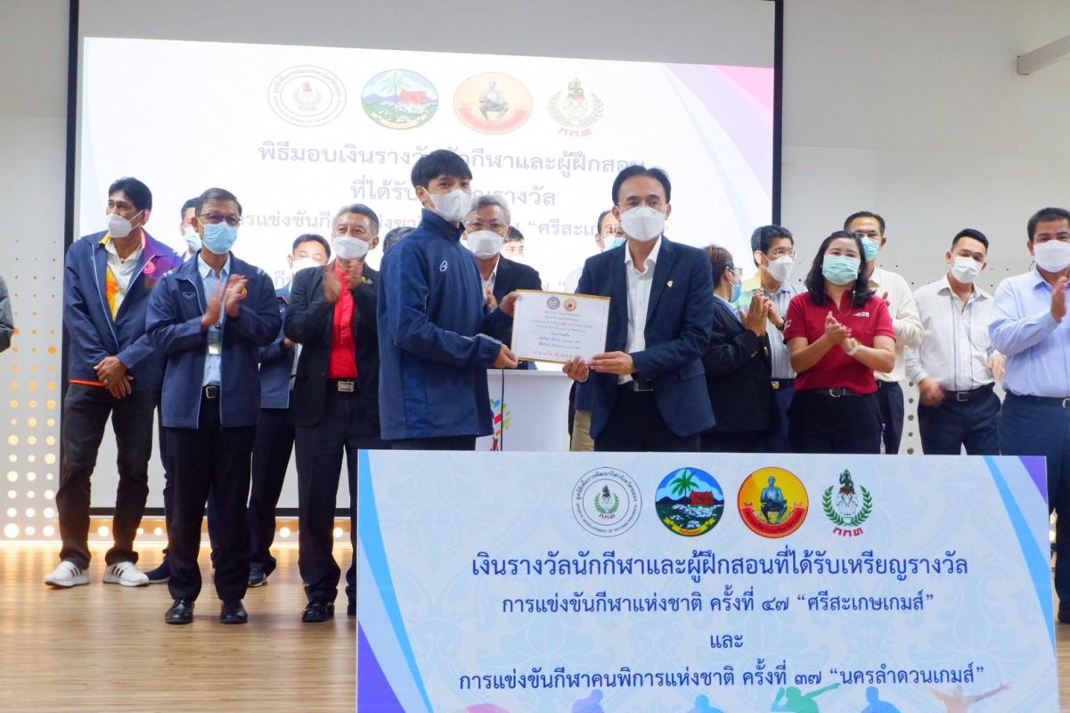 นางสาวอุมา วิภูษณะ ปฏิคมสมาคมกีฬาจังหวัดระยองนายหมอขวด เหล็กเพ็ชร อุปนายกสมาคมกีฬาจังหวัดระยองเป็นพิธีกรดำเนินงานจังหวัดระยองได้ส่งนักกีฬาและผู้ฝึกสอนเข้าร่วมการแข่งขันกีฬาแห่งชาติ ครั้งที่ 47 "ศรีสะเกษเกมส์" ระหว่างวันที่ 5-25 มีนาคม 2565 และการแข่งขันกีฬาคนพิการแห่งชาติ ครั้งที่ 37 "นครลำดวนเกมส์" ระหว่างวันที่ 30 มีนาคม - 3 เมษายน 2565 ณ สนามกีฬากลางจังหวัดศรีสะเกษ โดยการแข่งขันได้เสร็จสิ้นลงแล้วและได้ผลการแข่งขันดังนี้ การแข่งขันกีฬาแห่งชาติ ครั้งที่ 47 "ศรีสะเกษเกมส์" จำนวน 4 เหรียญทอง 16 เหรียญเงิน และ 9 เหรียญทองแดง รวม 29 เหรียญ การแข่งขันกีฬาคนพิการแห่งชาติ ครั้งที่ 37 "นครลำดวนเกมส์" จำนวน 1 เหรียญทอง 1 เหรียญเงิน และ 2 เหรียญทองแดง รวม 4 เหรียญผู้ว่าราชการจังหวัดระยองและคณะกรรมการพัฒนากีฬาจังหวัดระยองได้มอบเงินรางวัลเพื่อเป็นการสร้างขวัญและกำลังใจให้แก่นักกีฬาและผู้ฝึกสอนที่สร้างชื่อเสียงให้กับจังหวัดระยอง และมูลนิธิเพื่อการพัฒนาจังหวัดระยอง ซึ่งได้รับเงินสนับสนุนจากหน่วยงานทั้งภาครัฐและภาคเอกชน เป็นเงินทั้งสิ้น 360,450 บาท ตามหลักเกณฑ์ในระเบียบของมูลนิธิเพื่อการพัฒนากีฬาจังหวัดระยองทั้งนี้ ผู้ว่าราชการจังหวัดระยองได้กล่าวมอบนโยบายการพัฒนาการกีฬาของจังหวัดระยองทั้งนักกีฬาและผู้ฝึกสอนและกล่าวมอบโอวาทและให้กำลังใจแก่นักกีฬาและผู้ฝึกสอนรวมทั้งกลุ่มบริษัทและภาคเอกชนที่เป็นกำลังหลักแก่จังหวัดระยองในการสนับสนุนเงินรางวัลแก่นักกีฬาและผู้ฝึกสอนก่อนการบันทึกภาพร่วมกัน