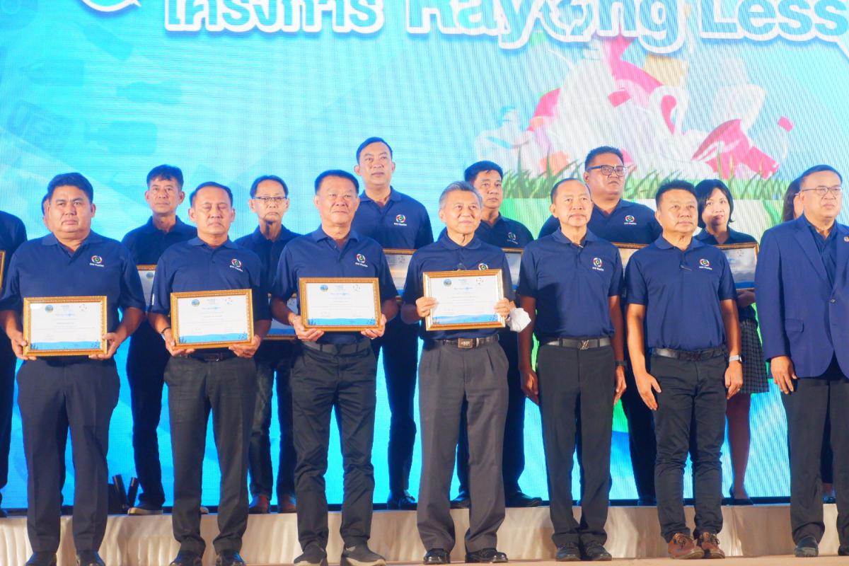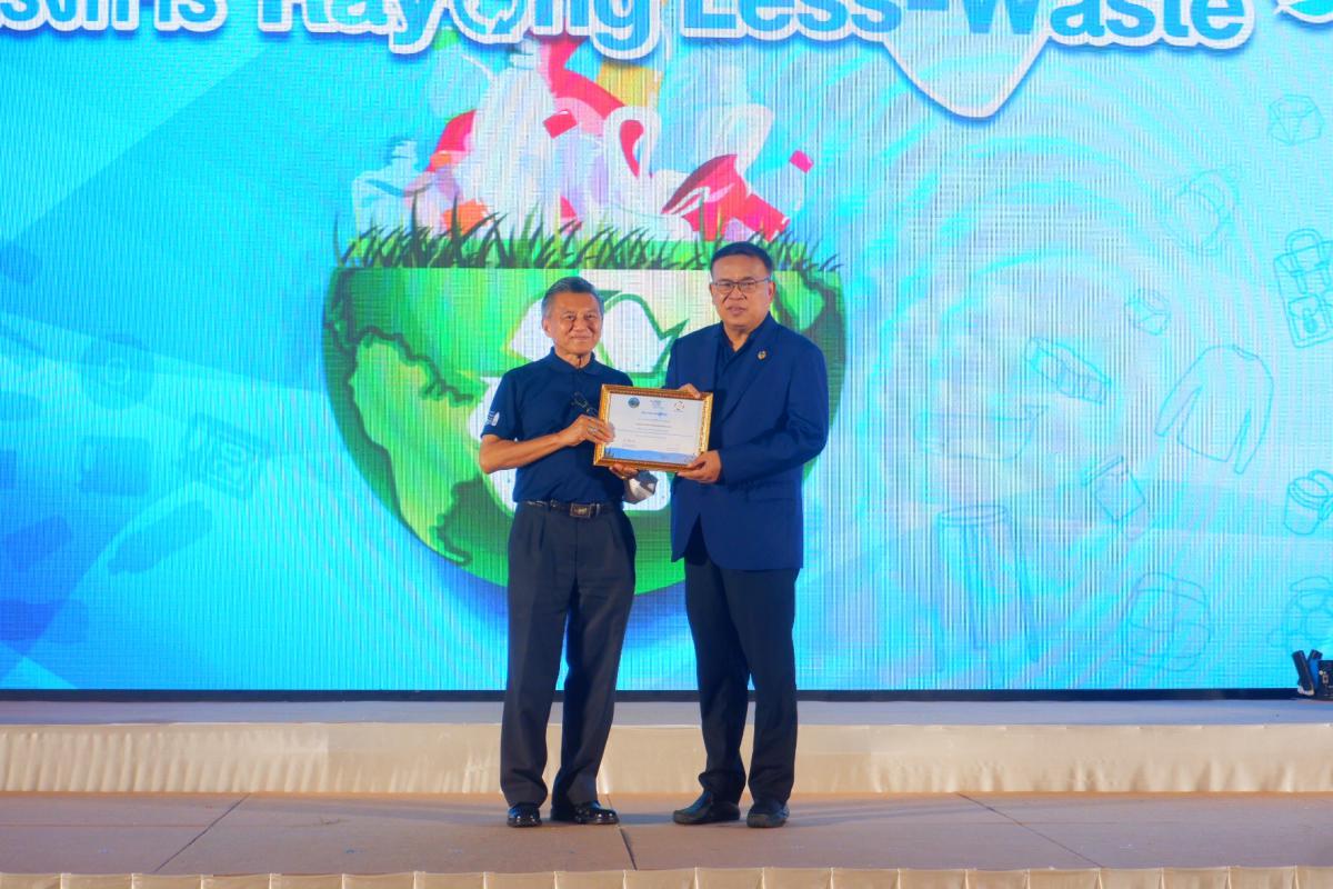 จากนั้น ได้มีพิธีมอบประกาศเกียรติคุณแก่องค์กรปกครองส่วนท้องถิ่นที่เข้าร่วมโครงการในพิธีลงนามความร่วมมือ เข้าร่วมโครงการความร่วมมือภาครัฐ ภาคธุรกิจ ภาคประชาสังคม เพื่อจัดการพลาสติกและขยะอย่างยั่งยืน พื้นที่นำร่องในจังหวัดระยอง ปี 2561 และ ปี 2563 จำนวน 36 องค์กร โดย ดร.วิจารย์ สิมาฉายา ผู้อำนวยการบริหารองค์กรธุรกิจเพื่อการพัฒนาอย่างยั่งยืน (TBCSD) เป็นผู้มอบใบประกาศเกียรติคุณ พร้อมทั้งถ่ายภาพร่วมกัน