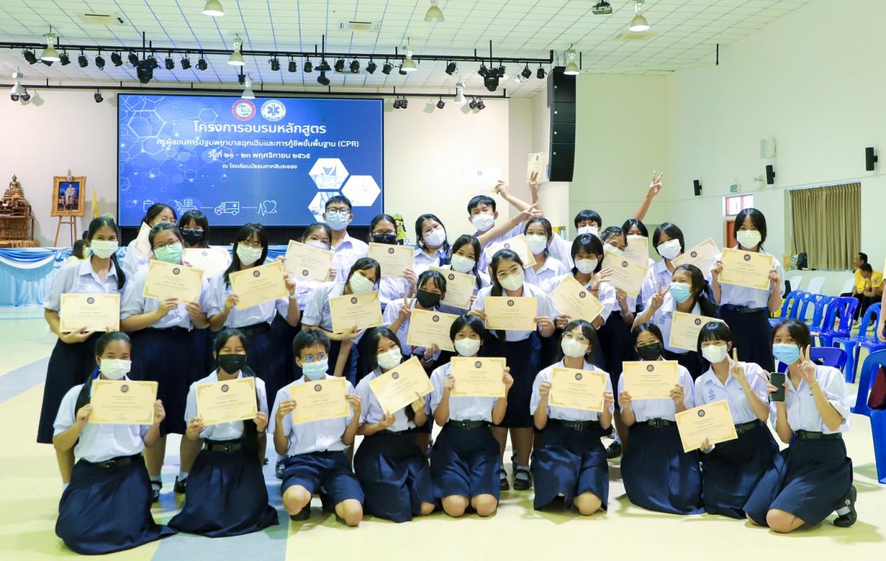 วันที่ 23 พฤศจิกายน 2565 การอบรมตามหลักสูตรครูผู้สอนการปฐมพยาบาลฉุกเฉินและการกู้ชีพขั้นพื้นฐาน CPR ณ หอประชุมอาคารเอนกประสงค์ ชั้น 3 โรงเรียนมัธยมตากสิน ซึ่งมีผู้เข้าร่วมโครงการอบรมในครั้งนี้ จำนวน 120 คน และแบ่งการอบรมออกเป็น 2 กลุ่มๆละ 60 คน ซึ่งโครงการอบรมหลักสูตรครูผู้สอนการปฐมพยาบาลฉุกเฉินและการกู้ชีพขั้นพื้นฐาน CPR ภายใต้การดำเนินงานของ อบจ.ระยอง ซึ่งได้ตระหนักและเห็นความสำคัญของการฟื้นคืนชีพในผู้ป่วยหัวใจหยุดเต้นนอกโรงพยาบาล จึงได้จัดอบรมหลักสูตรนี้ขึ้น ในระหว่างวันที่ 21-23 พฤศจิกายน 2565 โดยแบ่งการอบรมออกเป็น 2 กลุ่ม ซึ่งกลุ่มที่ 1เป็นกลุ่มบุคลากรในสังกัด อบจ.ระยอง, บุคลากรในสถานศึกษาที่สังกัด อบจ.ระยอง, เจ้าหน้าที่จากสมาคมและมูลนิธิ/กู้ภัยของ จ.ระยอง และประชาชนผู้ที่สนใจทั่วไป จำนวน 60 คน ซึ่งจะอบรมในระหว่างวันที่ 21-22 พฤศจิกายน 2565 และกลุ่มที่ 2 จะเป็นกลุ่มของนักเรียนในสถานศึกษาสังกัดองค์การบริหารส่วนจังหวัดระยอง จำนวน 60 คน ซึ่งจะเข้ารับการอบรมในวันที่ 23 พฤศจิกายน 2565 ซึ่งผู้เข้ารับการอบรมทุกท่านจะได้รับความรู้และทักษะในการปฐมพยาบาลฉุกเฉิน การกู้ชีพขั้นพื้นฐาน CPR การใช้เครื่องกระตุ้นไฟฟ้าหัวใจอัตโนมัติ AED ในการช่วยเหลือผู้ที่มีภาวะหัวใจหยุดเต้นแบบเฉียบพลัน พร้อมกันนี้จะได้รับความรู้จากระบบการแพทย์ฉุกเฉินและสิทธิผู้ป่วยฉุกเฉินวิกฤต UCEP จากวิทยากรจากสถาบันการแพทย์ฉุกเฉินแห่งชาติ และวิทยากรจากศูนย์การเรียนรู้ชมรมกู้ภัยสว่าง ชลบุรี
