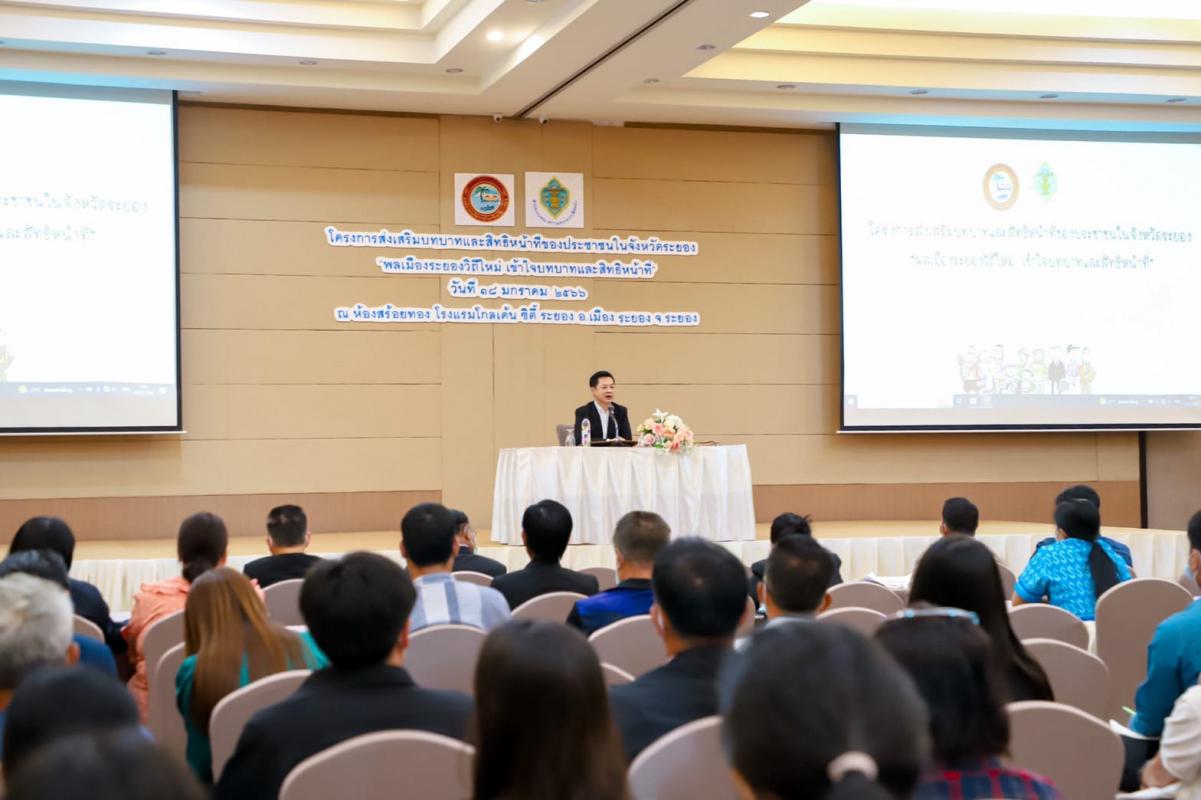 วันที่ 18 มกราคม 2566 เวลา 09.30 น. ณ ห้องสร้อยทอง โรงแรมโกลเด้นซิตี้ระยอง อ.เมืองระยอง จ.ระยอง นายกิตติ เกียรติ์มนตรี รองนายกองค์การบริหารส่วนจังหวัดระยอง (1) เป็นประธานในพิธีเปิดโครงการส่งเสริมบทบาทและสิทธิหน้าที่ของประชาชนในจังหวัดระยอง “พลเมืองระยองวิถีใหม่ เข้าใจบทบาทและสิทธิหน้าที่” พร้อมด้วย นายมนตรี ชนะชัยวิบูลวัฒน์ ที่ปรึกษานายกอบจ.ระยอง, นายอรุณ วิชกิจ ผู้เชี่ยวชาญพิเศษด้านการวางแผนและวิเคราะห์นโยบาย, นายสมเกียรติ ยุพาพิน รองปลัดอบจ.ระยอง รักษาราชการแทน ปลัดอบจ.ระยอง ผู้นำชุมชน และเจ้าหน้าที่ที่เกี่ยวข้อง เข้าร่วมงานโดยพร้อมเพรียงกัน